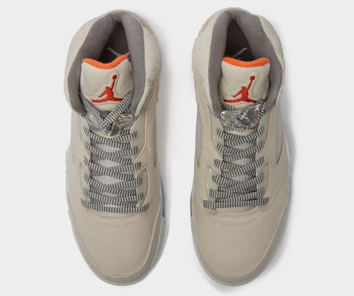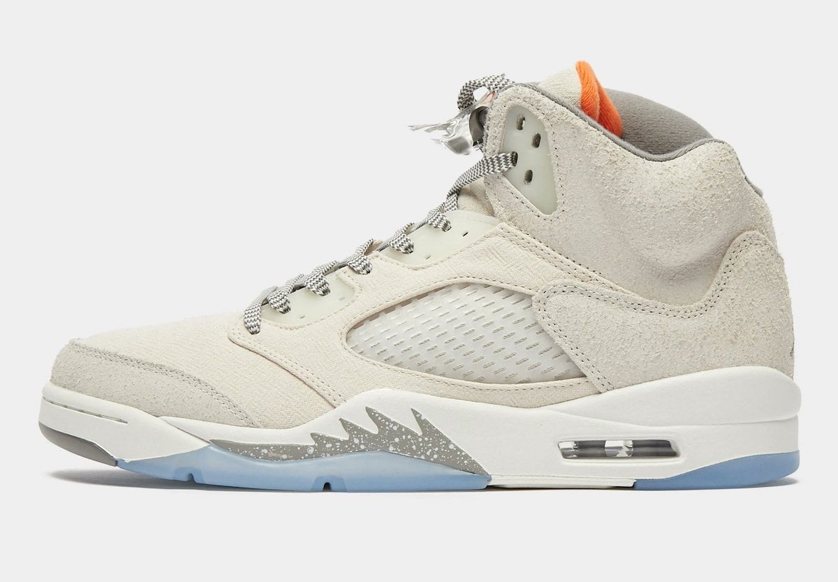 This Air Jordan 5 will feature a Light Orewood Brown, Safety Orange, Flat Pewter, and Sail color combination. Constructed with a mixture of premium materials, including suede with Orange on the tongue branding and inside of the tongue. Next, White adorns the midsole while Silver and speckled accents land on the teeth overlays. Finishing the look is an icy translucent outsole.