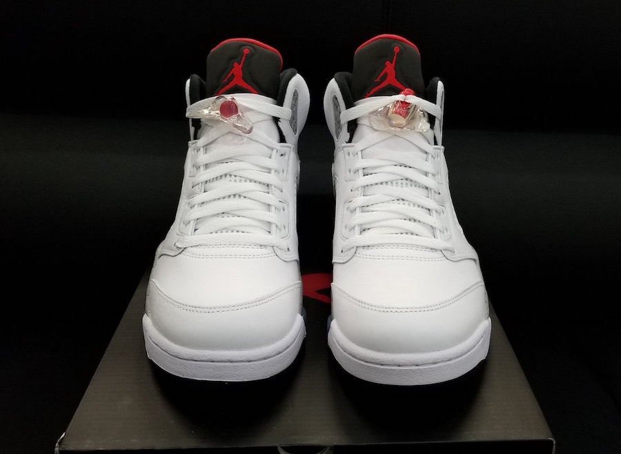 As you can see, this Air Jordan 5 features a White, University Red, Black, Cement Grey and Metallic Silver color combination. Constructed with White leather across the uppers, Cement print lands on the midsole as well as the top eyelet. Black lands on the tongue which has a 3M Reflective finish. Giving them the โFire Redโ feel is the use of University Red on the inside of the tongue and lace lock. Finishing the look is a translucent outsole.
