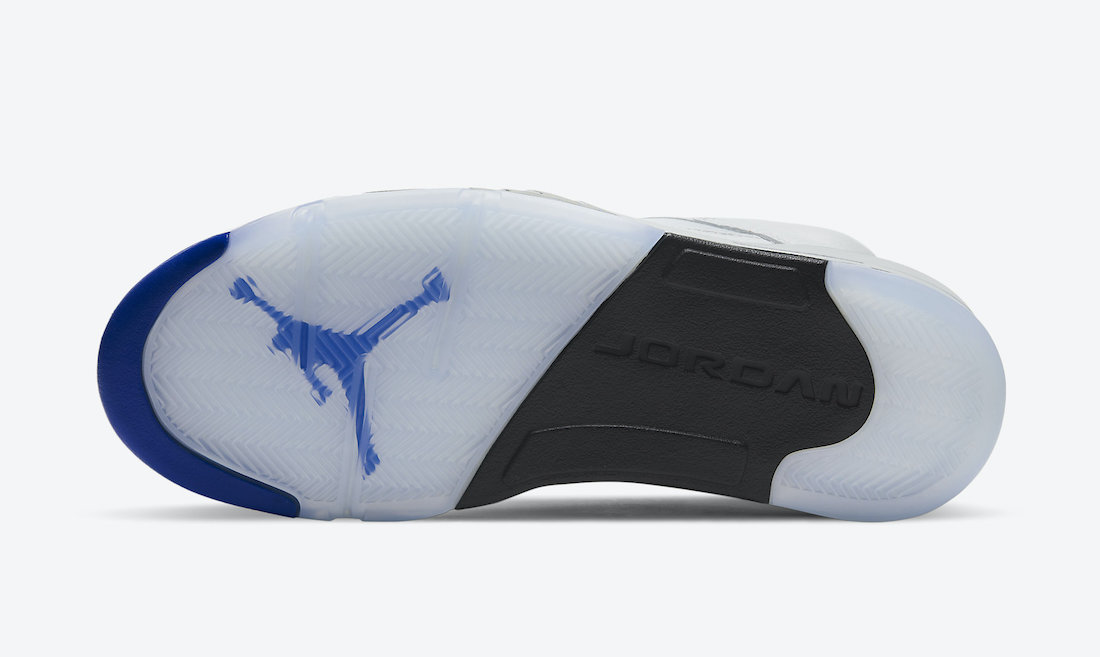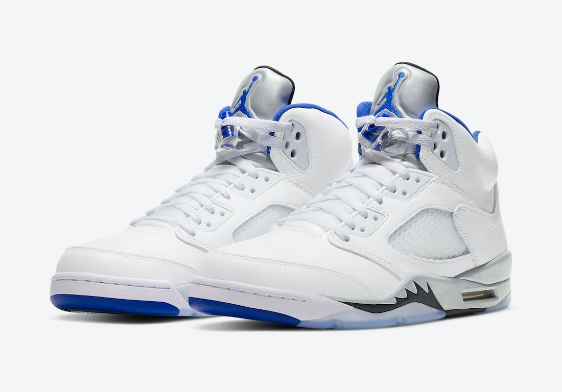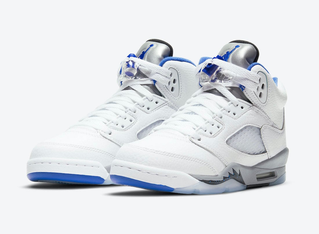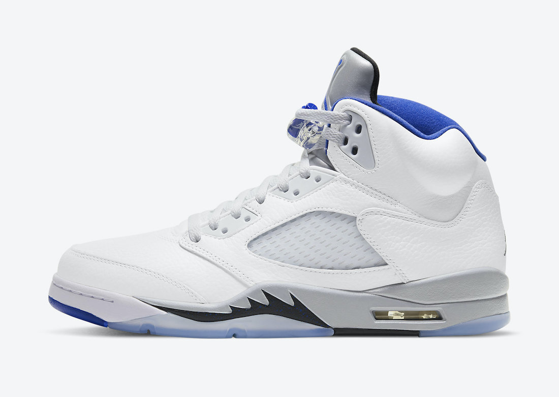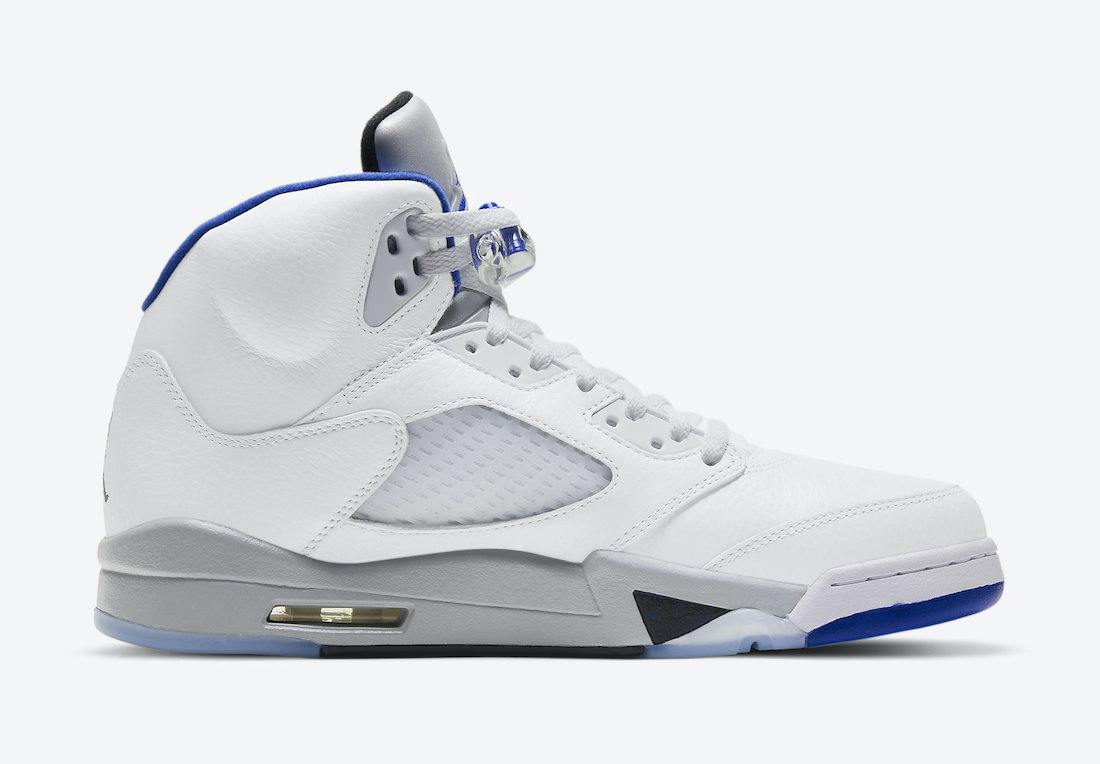 This Air Jordan 5 comes dressed in a White, Stealth, Black, and Hyper Royal color combination. This pair somewhat resembles the โStealthโ Air Jordan 5, which was initially launched in 2006. Using White throughout the upper while Silver lands on the tongue. Hyper Royal covers the liner, Jumpman on the tongue, and toe cap. A mixture of Stealth Grey and Black land on the midsole while a translucent rubber outsole completes the look.