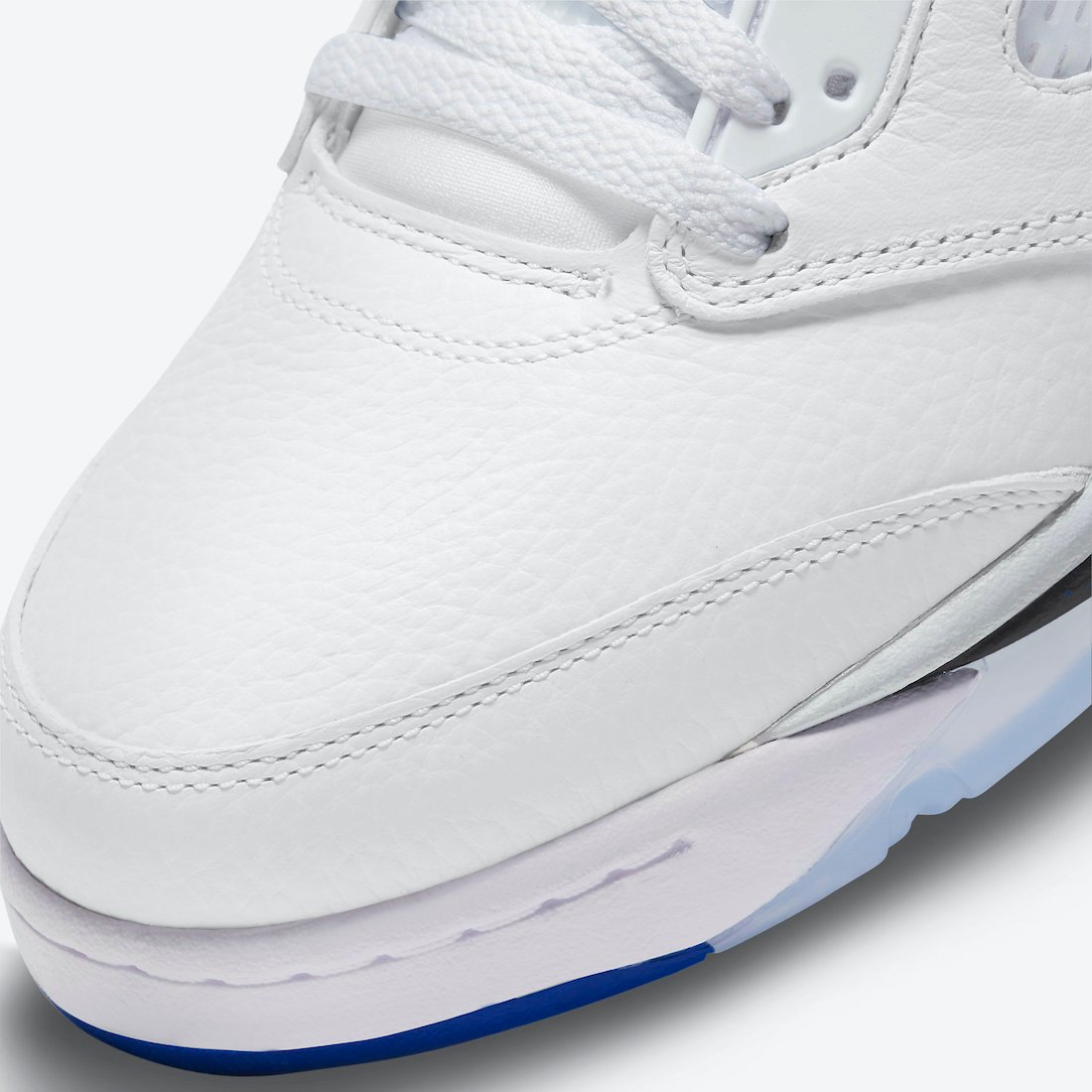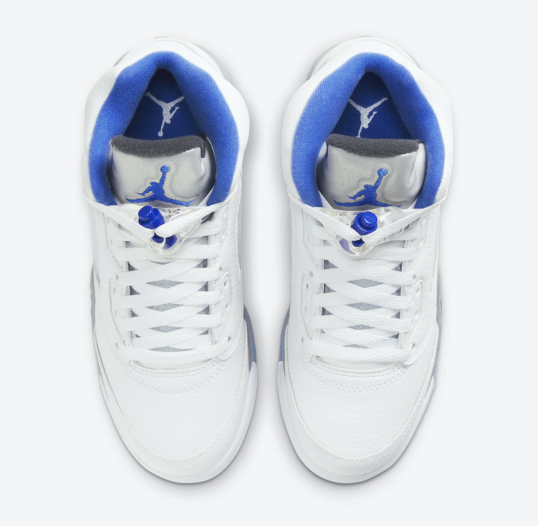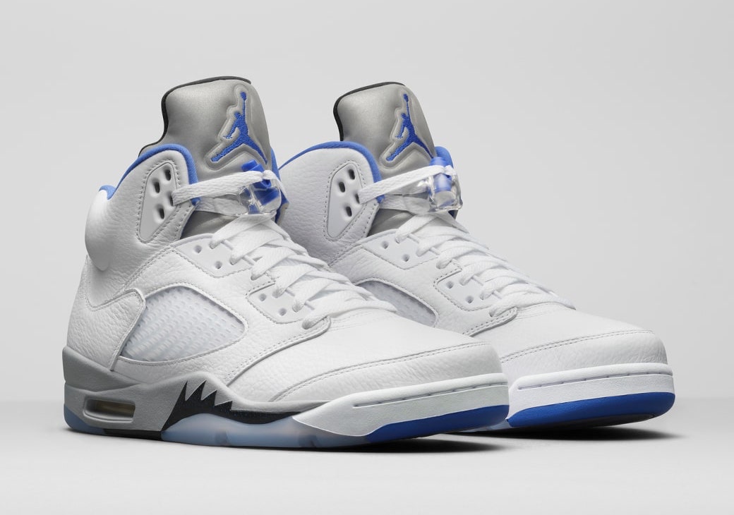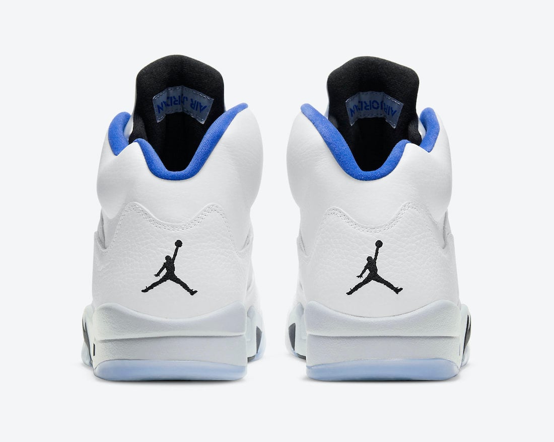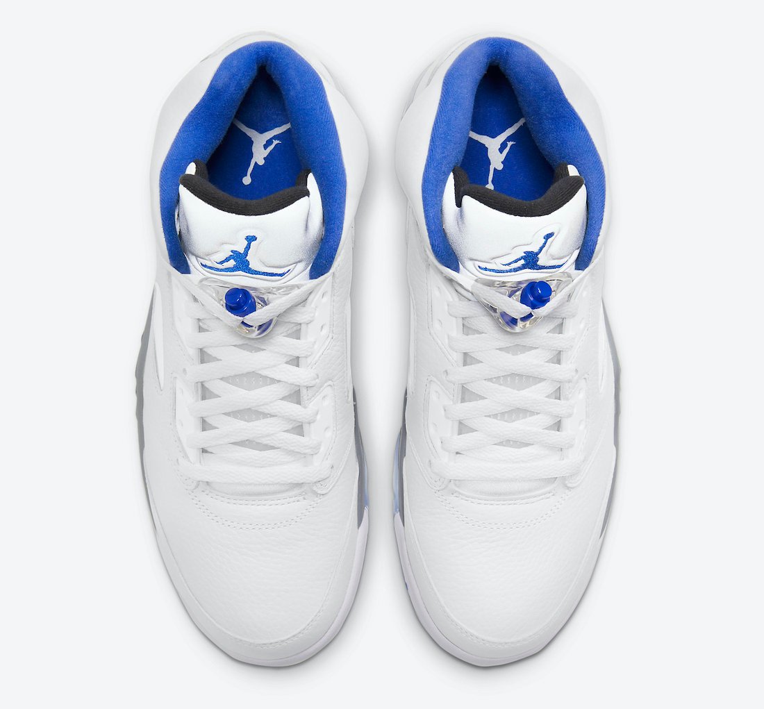 This Air Jordan 5 comes dressed in a White, Stealth, Black, and Hyper Royal color combination. This pair somewhat resembles the โStealthโ Air Jordan 5, which was initially launched in 2006. Using White throughout the upper while Silver lands on the tongue. Hyper Royal covers the liner, Jumpman on the tongue, and toe cap. A mixture of Stealth Grey and Black land on the midsole while a translucent rubber outsole completes the look.