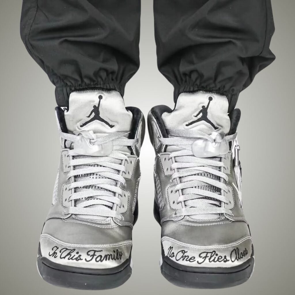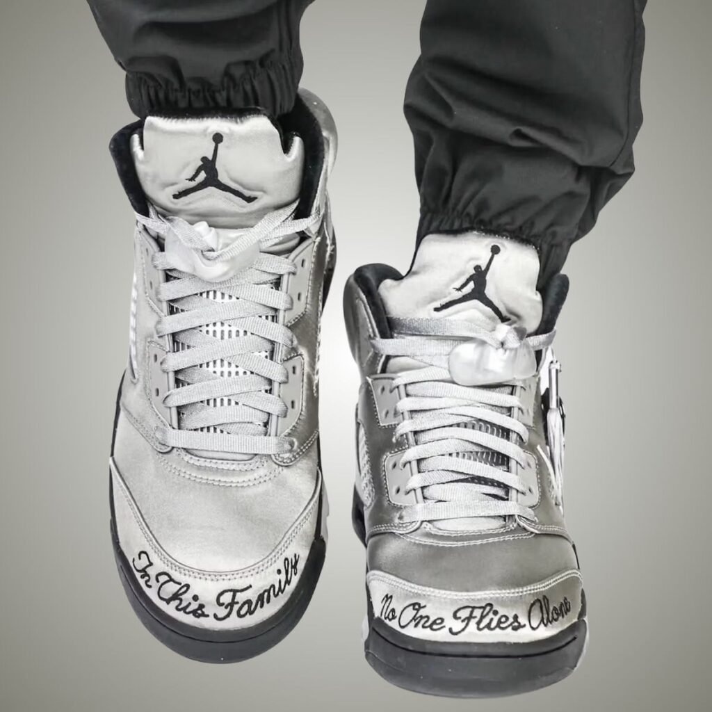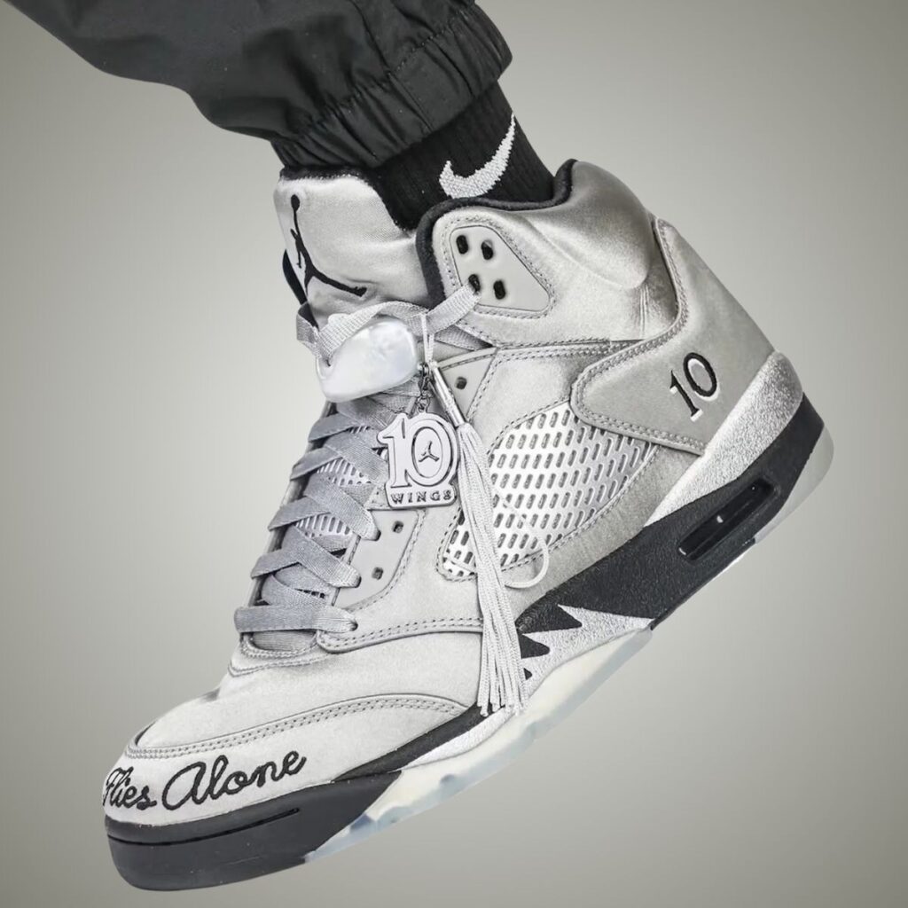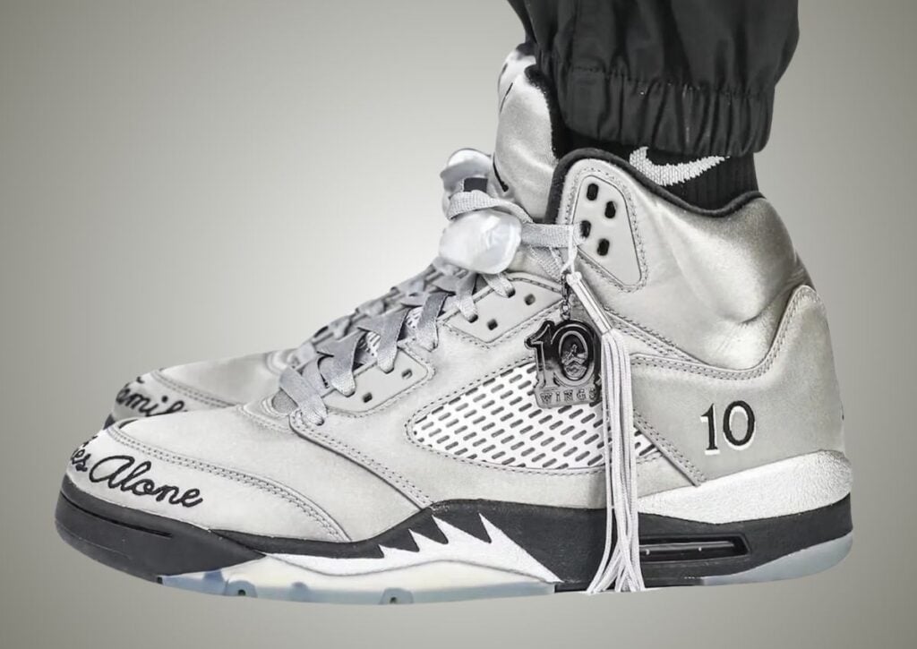 This Air Jordan 5 features a Medium Grey, Black, and Metallic Silver color scheme. As you can see, Grey covers the upper, which is constructed with satin, giving it a shiny look. In addition, the mesh will be reflective, while the Jumpman logo and โWingsโ appear on the heels. Next, we have โ10โ embroidered on the lateral side, hangtags with โWings,โ a Jumpman, 10, and a tassel. Embroidered around the right toe is โIn This Family,โ while the left toe reads, โNo One Flies Alone.โ Other details include Black detailing and a translucent rubber outsole with a handprint.