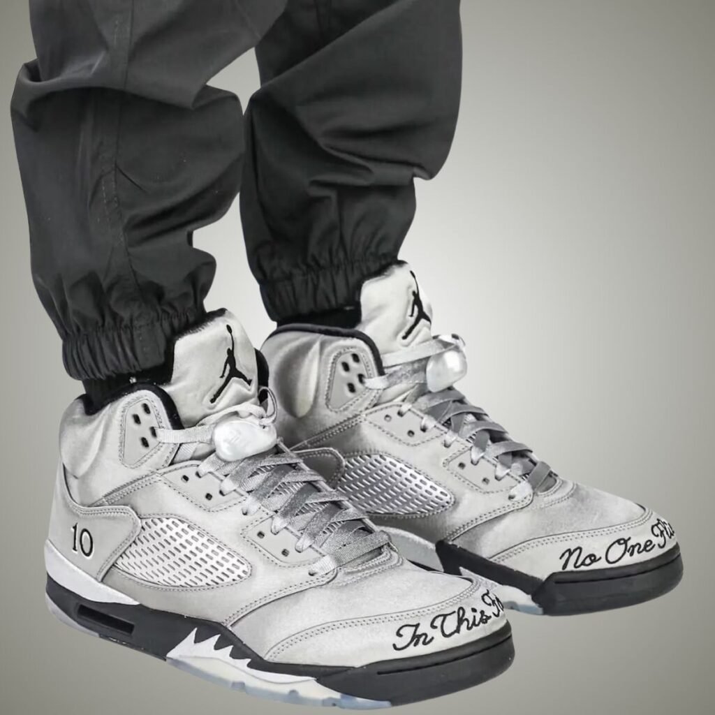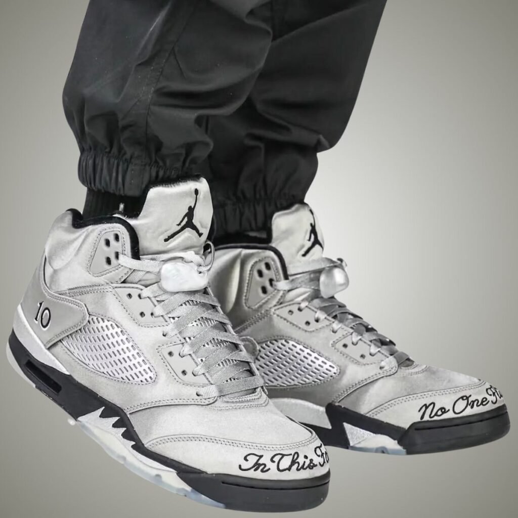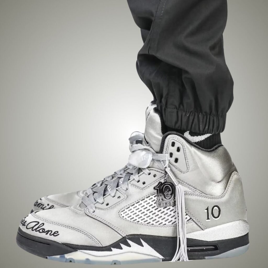 This Air Jordan 5 features a Medium Grey, Black, and Metallic Silver color scheme. As you can see, Grey covers the upper, which is constructed with satin, giving it a shiny look. In addition, the mesh will be reflective, while the Jumpman logo and โWingsโ appear on the heels. Next, we have โ10โ embroidered on the lateral side, hangtags with โWings,โ a Jumpman, 10, and a tassel. Embroidered around the right toe is โIn This Family,โ while the left toe reads, โNo One Flies Alone.โ Other details include Black detailing and a translucent rubber outsole with a handprint.