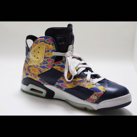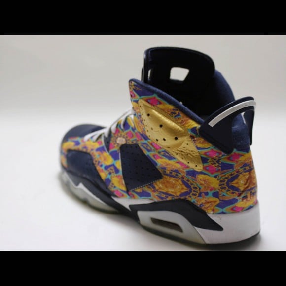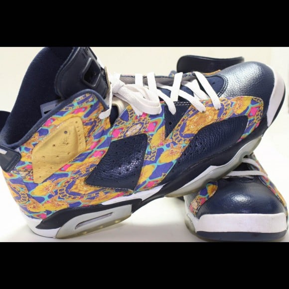 The Air Jordan 6 “Carlton Banks” customs by ODD SECRET arrive with navy blue leather panels, with a festive, baroque print adorning the uppers. The baroque print mixes tones of fuschia, purple, teal and a heavy use of yellow gold; a reference to The navy blue leather appears on the toe caps and midfoot panels. ODD chose to stick with the original sole unit, and even kept the icy outsoles that sneakerheads are going bonkers for right now!