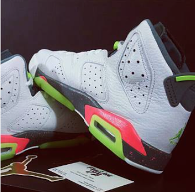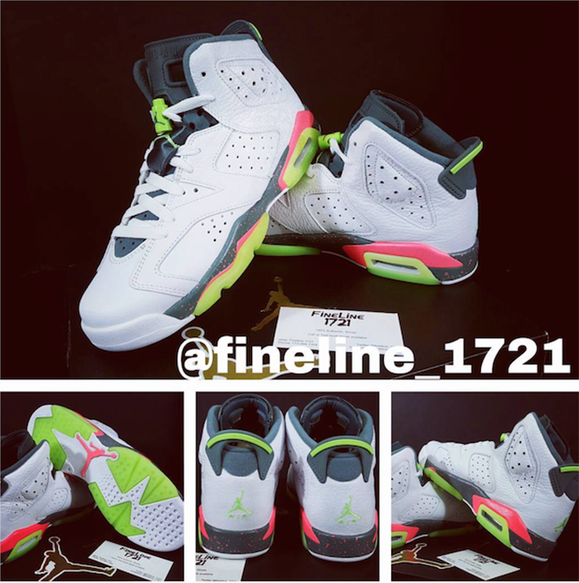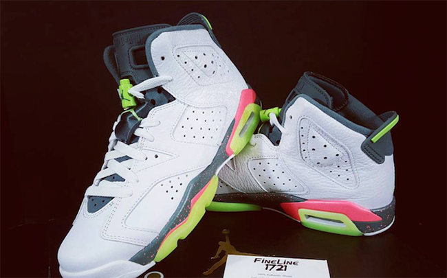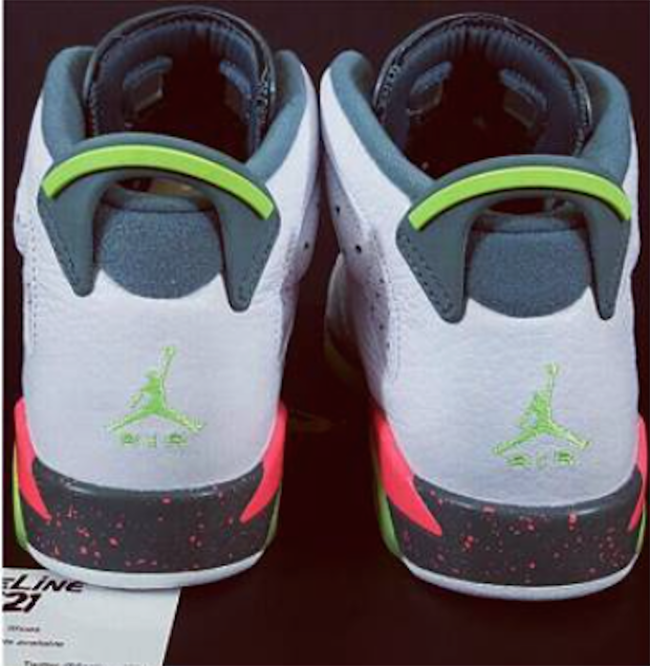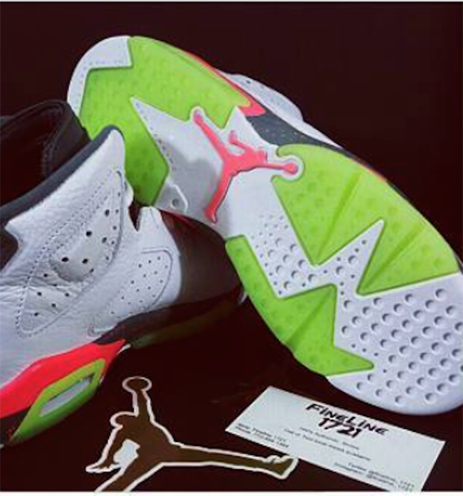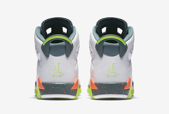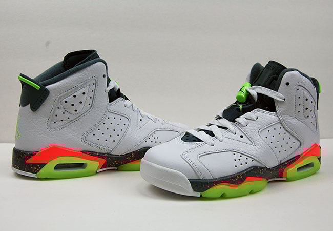 Featuring a White, Ghost Green, Hasta and Bright Mango color scheme which allows this Air Jordan 6 to really standout. White leather lands on the uppers while there is a bit of tumbled leather used also. Bright Mango lands through the midsole with a speckled overlay while Ghost Green is used on the heel, lace lock and outsole.