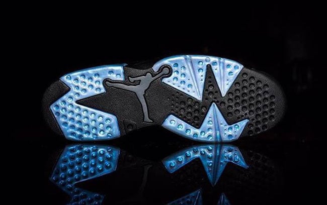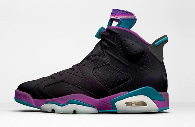 This Air Jordan 6 will feature Black through the uppers along with an iridescent finish. In addition, Teal and Purple accents will be used which will complete the Charlotte Hornets theme.