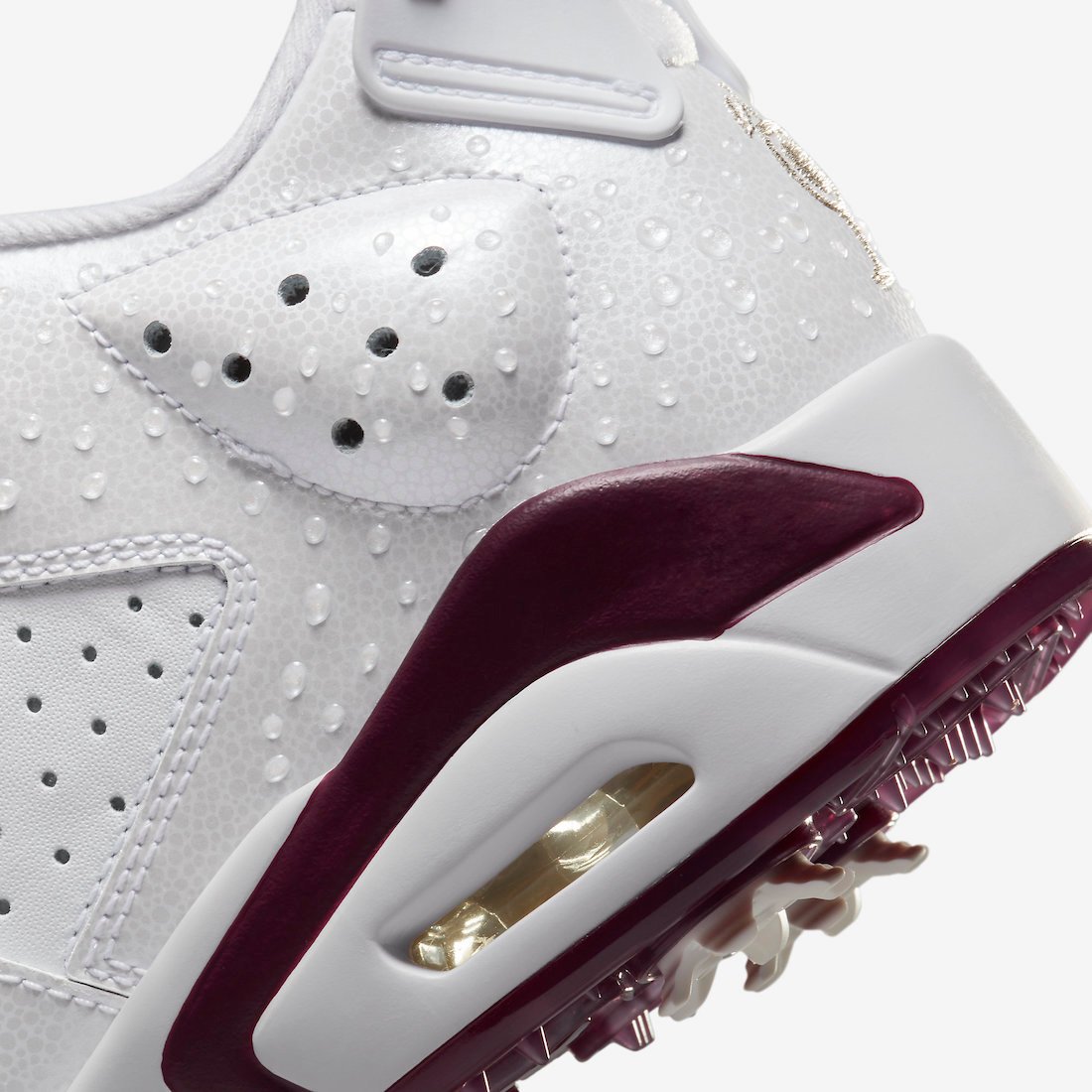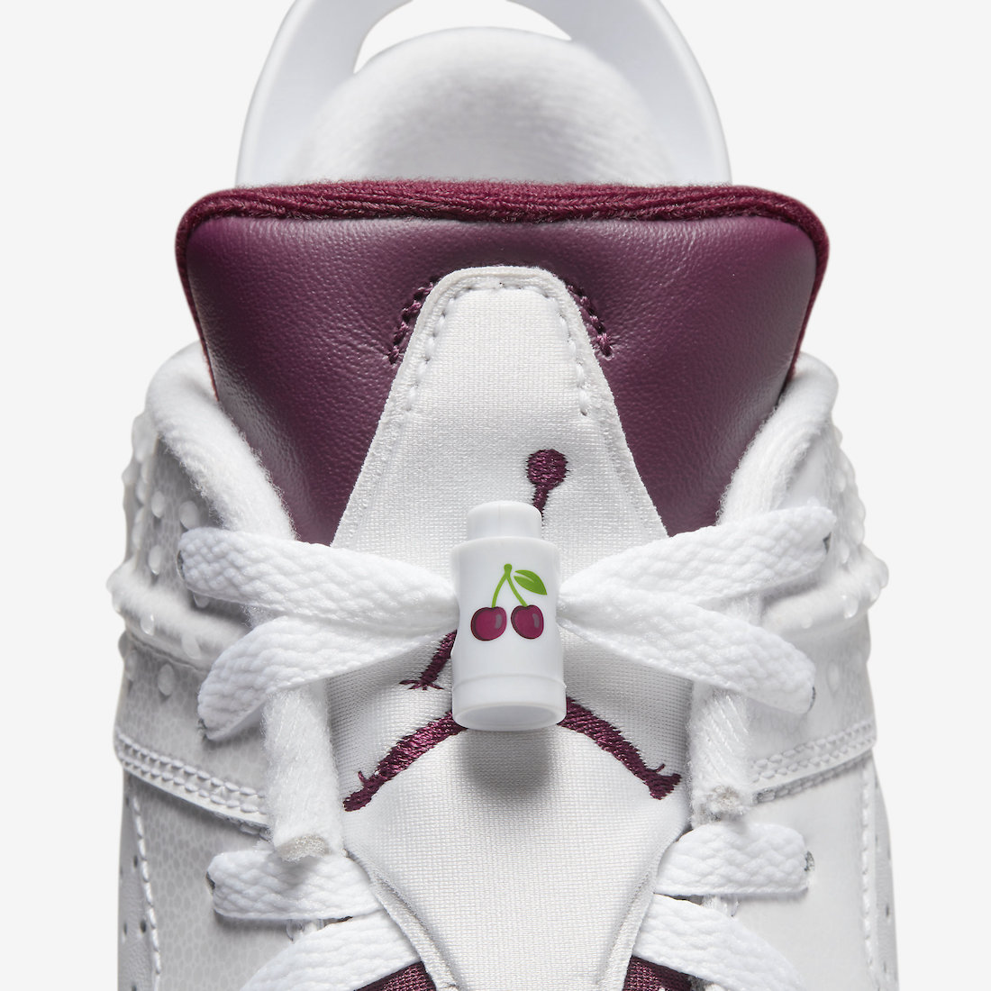 Keeping things simple, this golf iteration of the Air Jordan 6 features a White and Bordeaux color combination. The inspiration for this shoe comes from Michael Jordanโs favorite beverage, 1 that goes down smooth with a big plate of barbecue and a side of cobbler while basking in warmhearted hospitality. Next, we have White across the upper, Bordeaux accents, and a Cherry logo on the lace locks. Other details include Jumpman golf branding on the insoles, embroidered trophy on the heels, and a translucent outsole with golf spikes.
