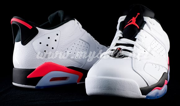 The Infrared Air Jordan 6 Low comes with white leather uppers, the use of infrared spread throughout and the addition of black on the midsole which was not present on the mid. The tongue on the lows will be in black while it’s counterpart featured white.
