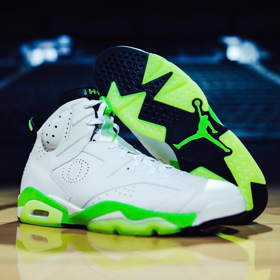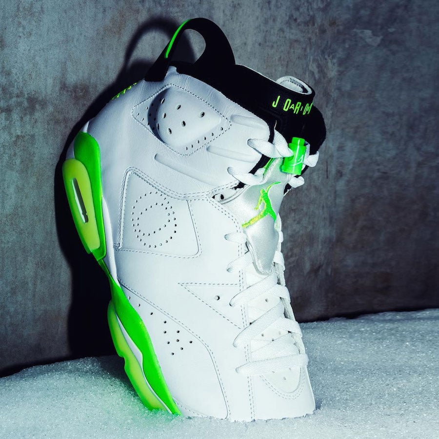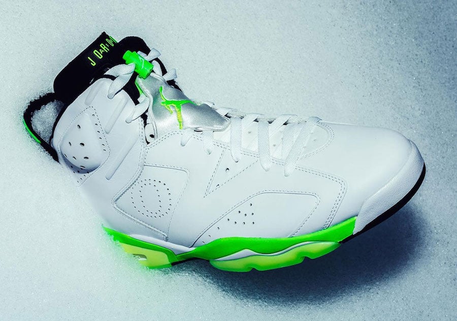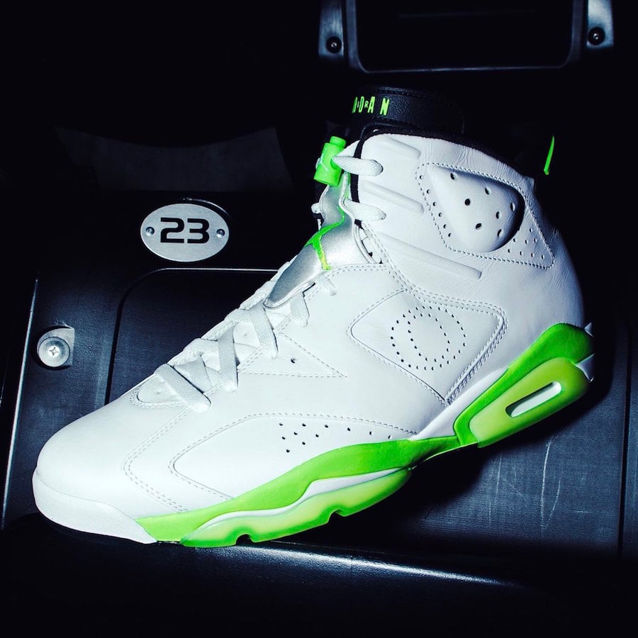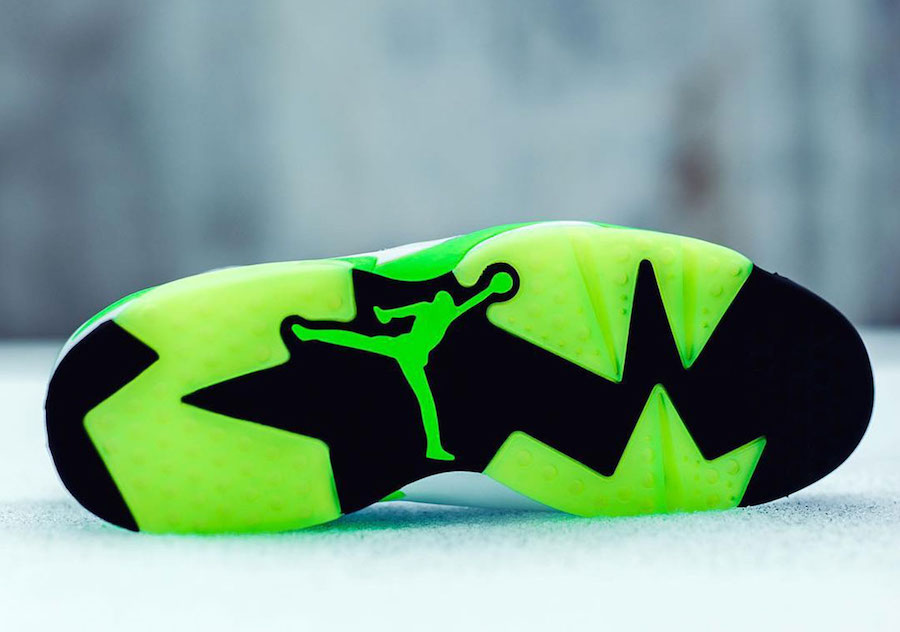 Looking closer this pair features White leather across the upper while the โOโ branding on the panels is perforated. In addition we have Black on the tongue and heel tab. What sticks out the most is the Fluorescent Green which lands on the midsole, Jumpman on the tongue and other branding. Finishing the look is an embroidered logo on the heel and a translucent outsole.