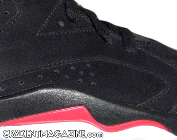 In our Jordan Brand 2010 Preview, we showcased catalog scans of upcoming Air Jordans, including the highly sought after “Infrared” Air Jordan 6 (VI). Jordan Brand will be bringing back one of the most popular sneakers ever next year, but there will be two catches. The first is that varsity red will replace infrared accents, and the second catch is that the sneaker will come in suede rather than the original nubuck material. Other key aspects of this AJ 6 are the out-sole which appears to be white rather than a clear sole and the air bubble which is black rather than clear. Please be aware that this pair is only a sample, and we will surely keep you up to date as soon as any more information or pictures become available. The Air Jordan 6 (VI) Retro – Black/Varsity Red is scheduled to release in January 2010.