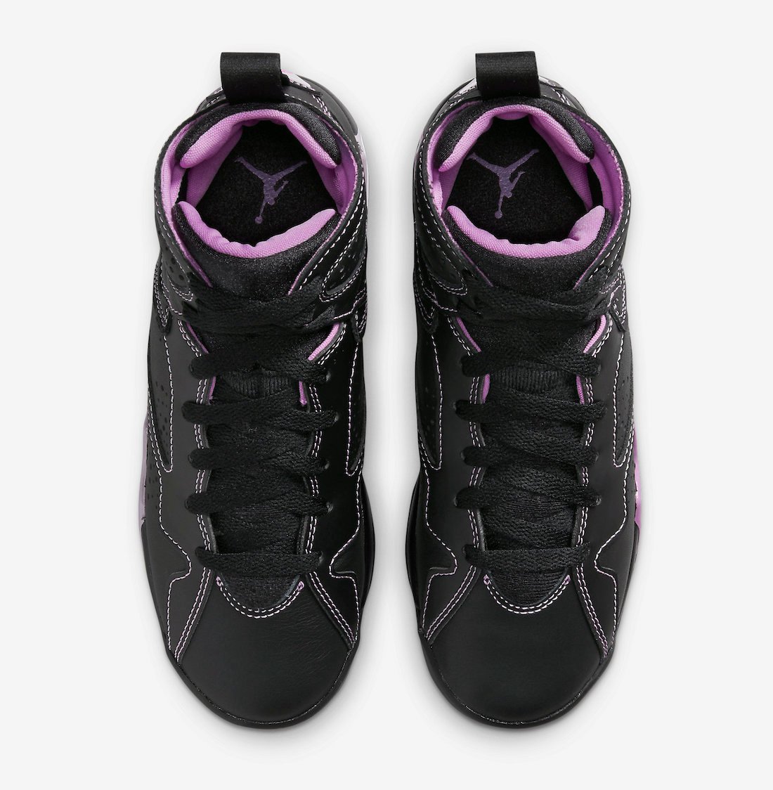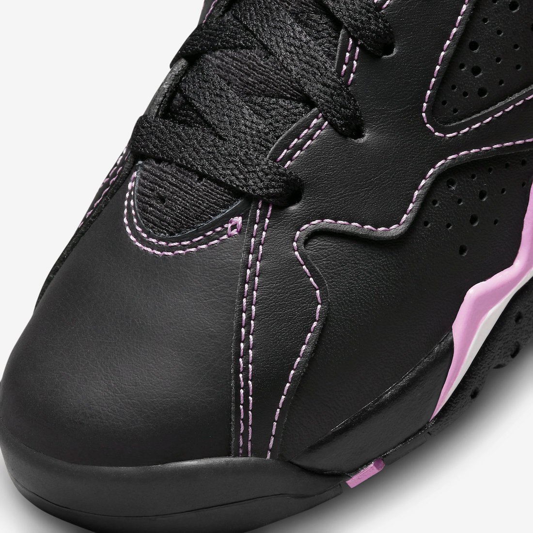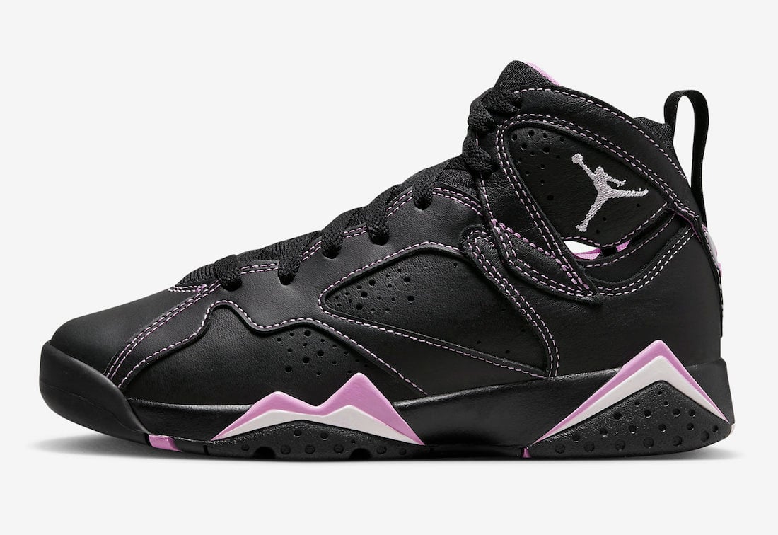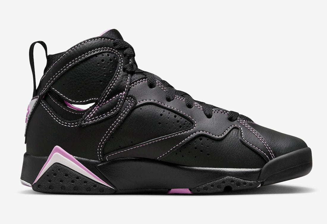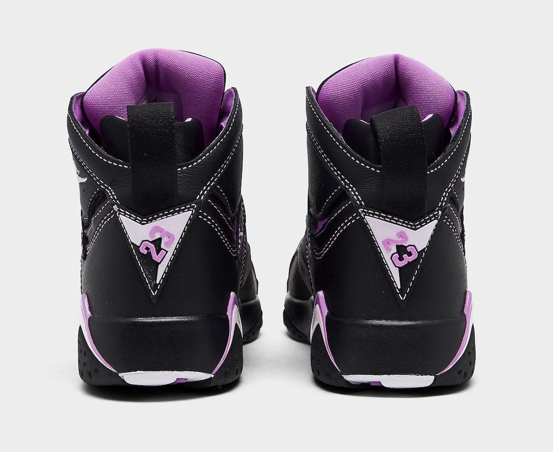 This Air Jordan 7 comes dressed in a Black, Barely Grape, and Rush Fuchsia color combination. The photo used is a mock-up. However, itโs an accurate representation of whatโs releasing. Constructed with Black nubuck, the pair has Grape contrast stitching throughout. Other details include Purple accents on the midsole and a Black rubber outsole.
