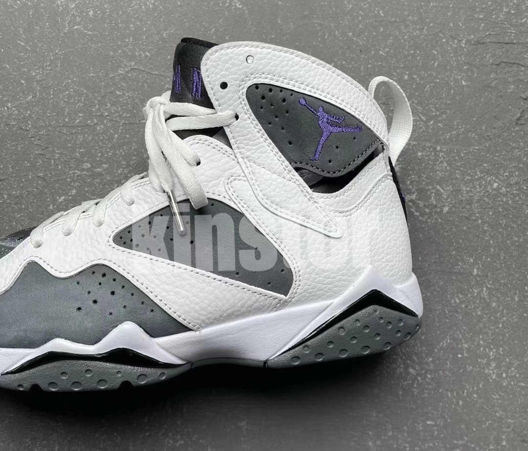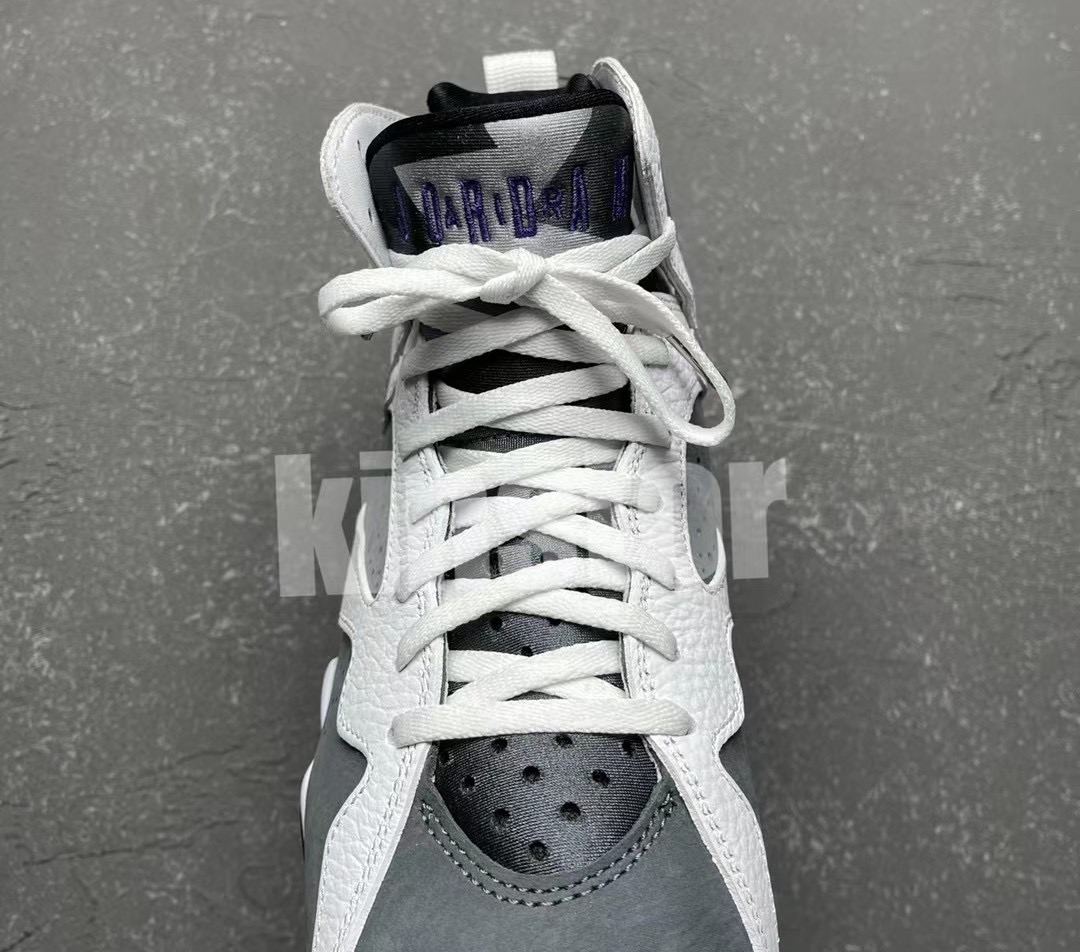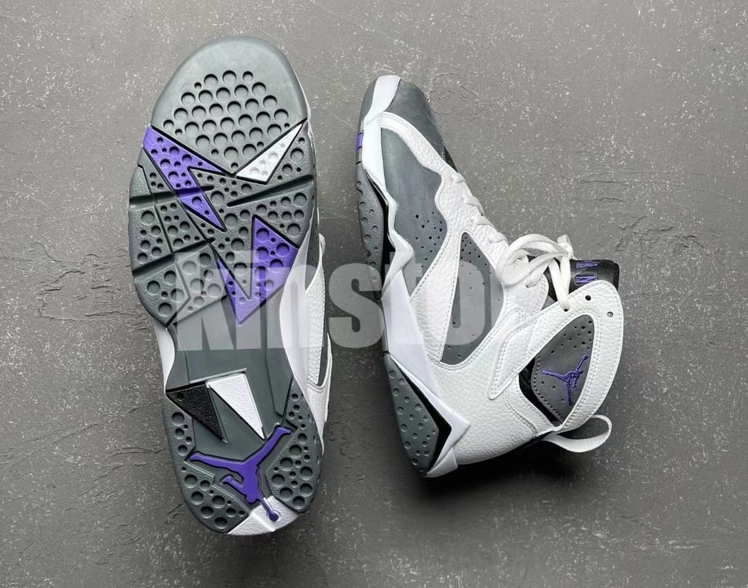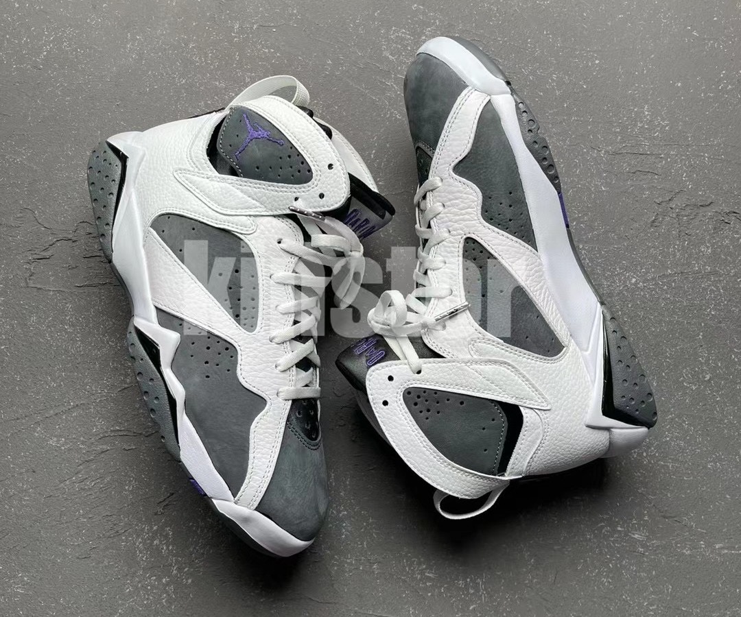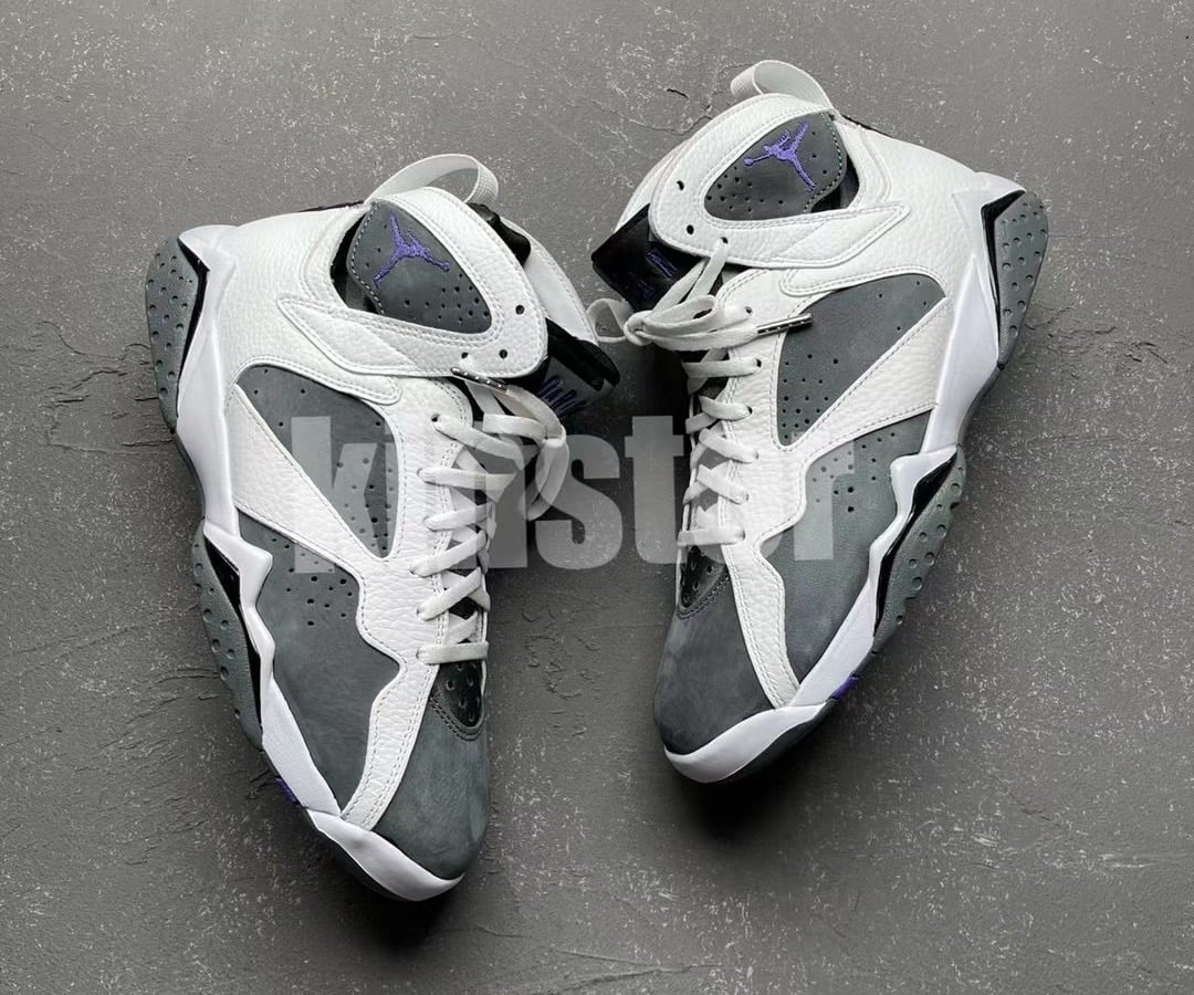 This Air Jordan 7 comes dressed in a White, Varsity Purple and Flint Grey color combination. Furthermore, the pair will mimic the original. Utilizing White leather across the upper, Grey on the base, along with Purple on the branding. Finishing the look is Black detailing.