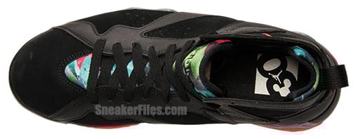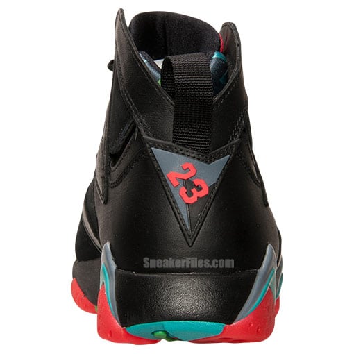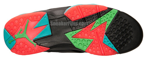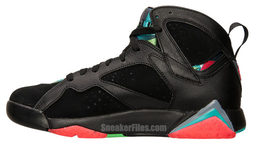 Taking inspiration from one of the Looney Tunes characters, the Marvin the Martian Air Jordan 7 is dressed with black leather and nubuck. The use of infrared, graphite and retro (teal like color) is fused within the tongue, bootie and the midsole. An infrared Jumpman is used on the sides which sticks out nicely.
