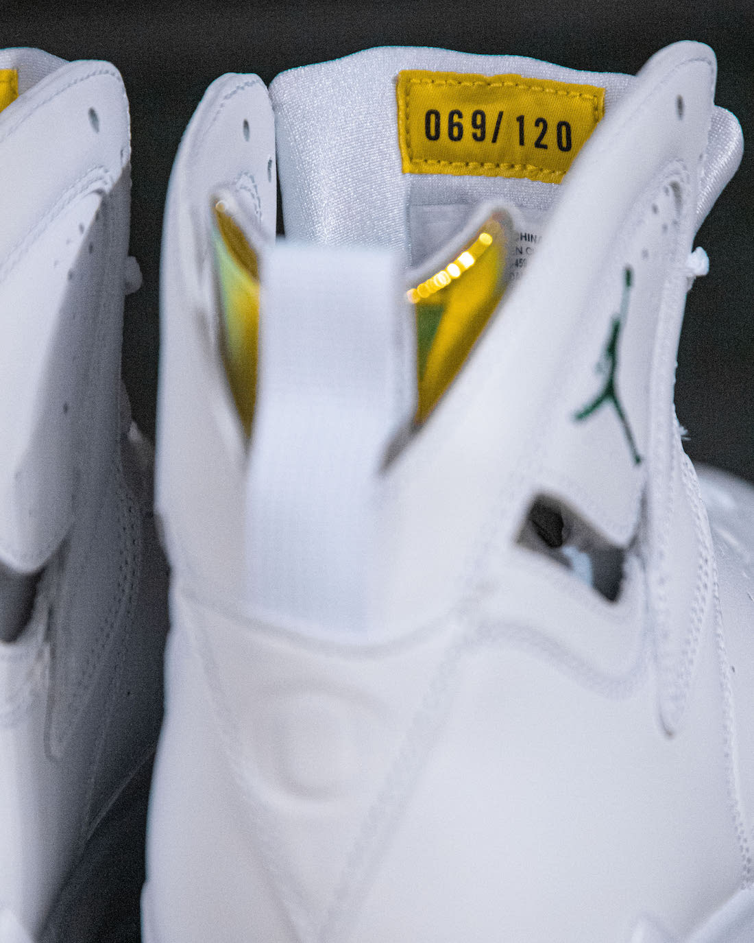 Looking closer, this Air Jordan 7 PE comes with White leather across the uppers while the same shade adorns the midsole and rubber outsole. Next, we have Ducks branding, which includes a debossed โOโ on the heels along with a Green and Yellow chenille โUOโ patch lands on the Metallic Gold tongues. Furthermore, we have a Green Jumpman on the lateral ankle. Lastly, each pair is individually numbered to 120 pairs that you can see on the woven label inside of the tongue.