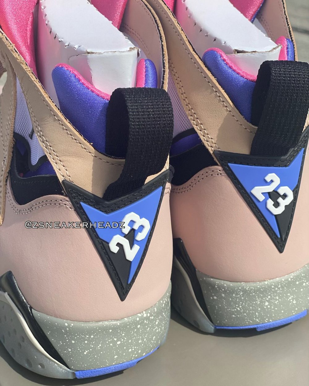 Looking closer, this Air Jordan 7 will come dressed in a Shimmer, Black, and Sapphire color combination. Highlighted with Light Shimmer across the uppers while accents of Pink and Purple run throughout. Next, we have semi-translucent panels and ankle, Black detailing, and a Grey speckled midsole that finishes the look.