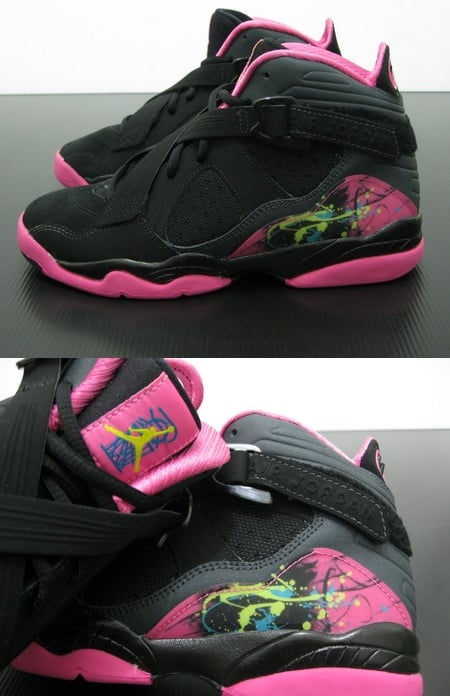 The Air Jordan 8.0 GS Black/Hot Pink utilizes a mix of mesh and nubuck, with a black base, hot pink and voltage accents.