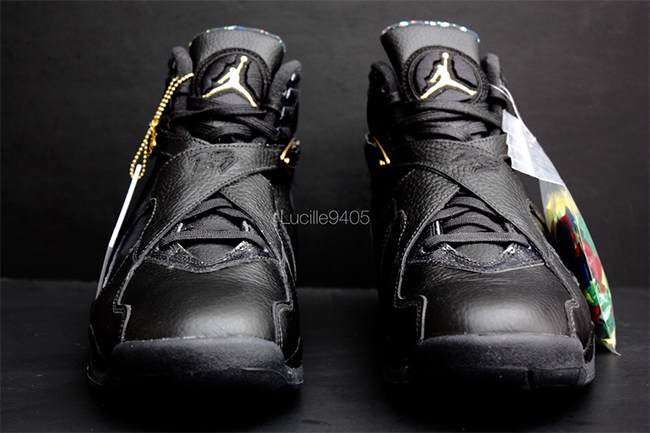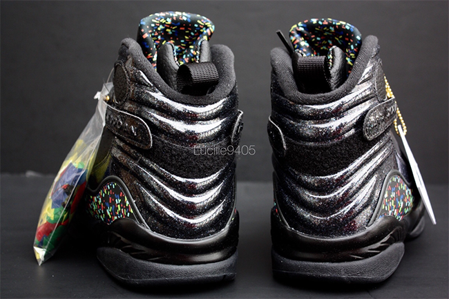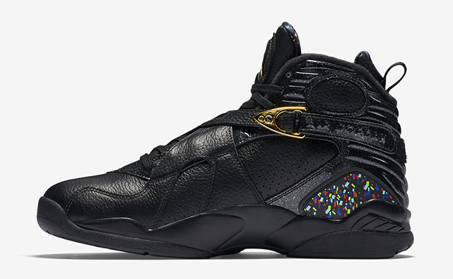 This celebratory Air Jordan 8 is dressed in Black, Metallic Gold and Anthracite. While most of the sneakers are dressed in Black, tumbled leather covers the toe and side panels while a shiny, almost glitter look wraps the heel. Metallic Gold is then applied to the Jumpman branding on the tongue and buckle. Last but not least is confetti in multiple colors that hits both the medial and lateral sides along with inside of the tongue.