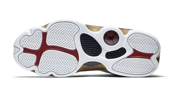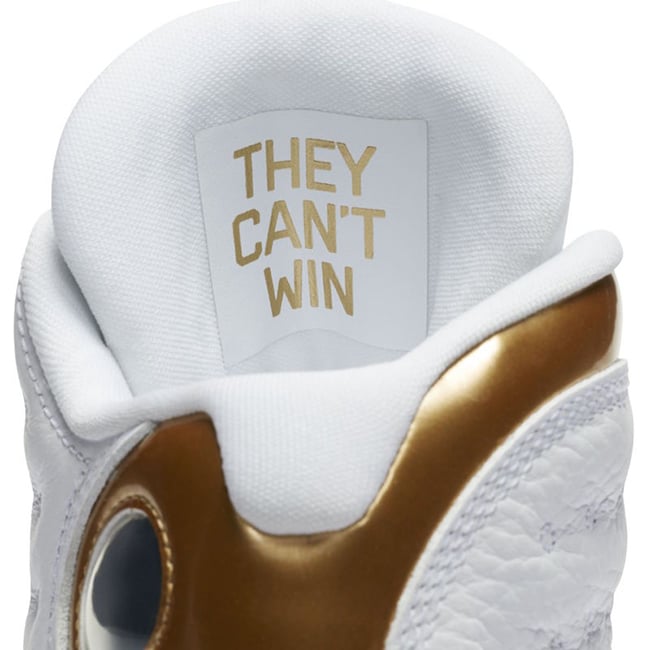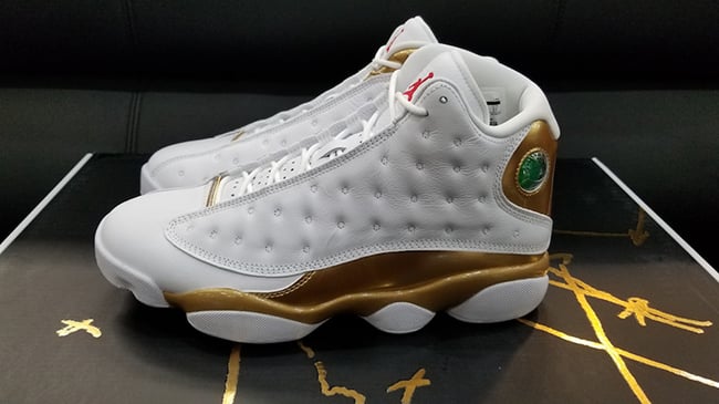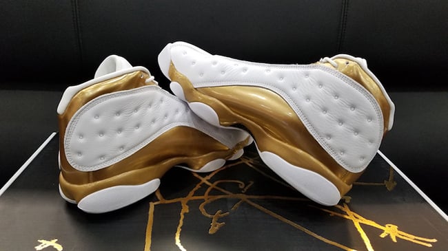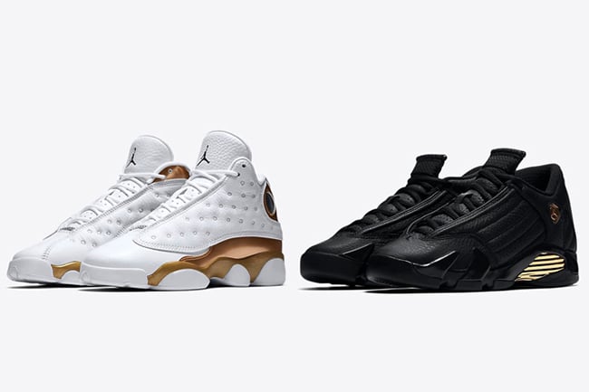 The Air Jordan 13 features a predominate White leather app while the hologram features the year 98 with an image of Jordan. The Air Jordan 14 is done in Black while the heel reads 98. The two come with Metallic Gold accents which is a tribute to the Larry OโBrien NBA Championship trophy.