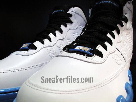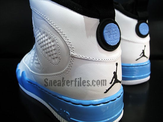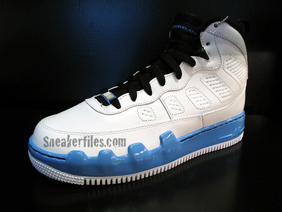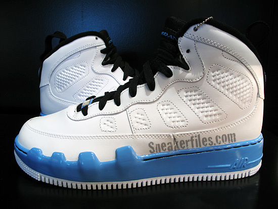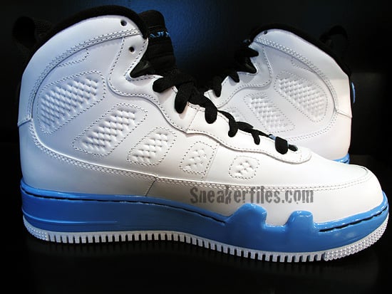 With the Air Jordan Fusion IX (9) series debuting this weekend, we present to you a detailed look at the White/Black-University Blue colorway of the AJF9. This pair features a white leather upper accented by a university blue midsole, a black tongue, and black laces. Other university blue accents on this pair can be seen via the tongue, heel, and lace tag. Though this style includes university blue, the colorway as a whole is quite similar to the Original “Powder” Air Jordan IX (9) which released back in 1993. The Air Jordan Fusion IX (9) essentially maintains the upper of the Air Jordan 9 while adding key components of the Air Force 1 to the sole. The Air Jordan Fusion IX (9) – White/Black-University Blue is set to drop on April 11, 2009 for a retail price of $160. Be sure to check out the detailed pictures after the ‘jump.’