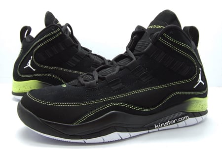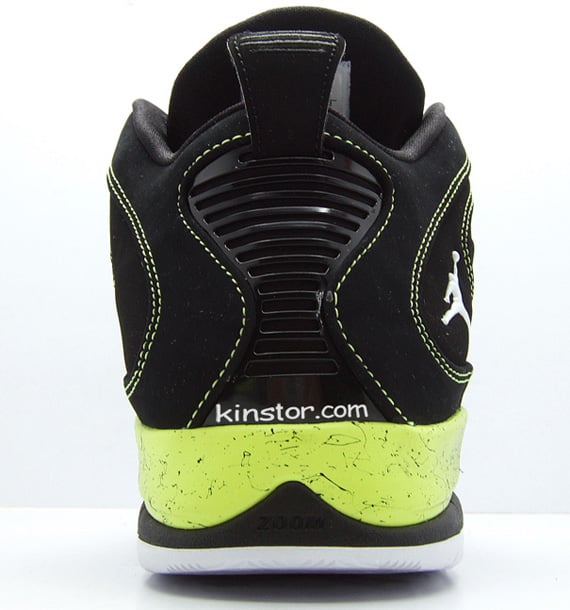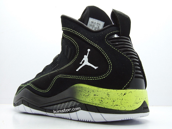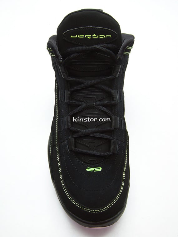 Jordan Brand is slowly creating a family of black/yellow shoes, including the Winterized Jordan Spizikes, and now, the Air Jordan Hallowed Ground. The Hallowed Ground comes in a clean black/volt colorway, using black nubuck on the upper with volt yellow contrast stitching. The black midsole features a speckled volt gradient design towards the heel, along with carbon fiber accents to give the shoe a high performance look. The dark upper is offset by a white outsole to match the white Jordan symbol at the side. Jordan is found in volt on the tongue to complete this basketball shoe. It’s available early for $100 online.