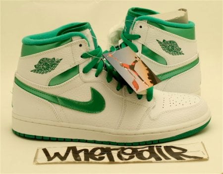 The “Do The Right Thing Pack”, featuring a white/metallic red and white/metallic green Air Jordan I (1) is available early on eBay. The main difference betwixt the release versions available and previous samples is the inner lining. Samples included a multicolored liner, while the release versions are one solid tone. Both shoes feature a tumbled leather upper, and most sellers have them hovering around the $110-115 range, each. If you’re willing to wait, the Air Jordan Do The Right Thing Pack will hit Brand Jordan accounts on July 4, 2009.