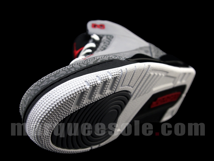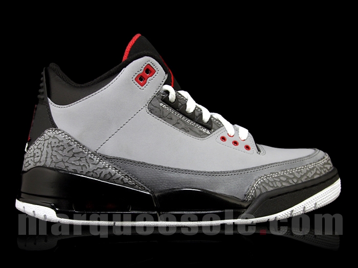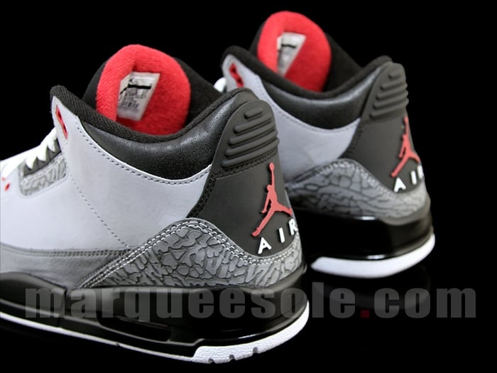 Black, white & stealth grey is featured throughout on this all new AJ3 colorway with color blocking similar to that of an Air Jordan 1 Retro High that had released last year. Elephant print has been placed on the toe, heel and eyelet panel. Lizard embossed leather has been used with a soft nubuck on the upper panels. Red hits are seen throughout including a red heel Air Bag.