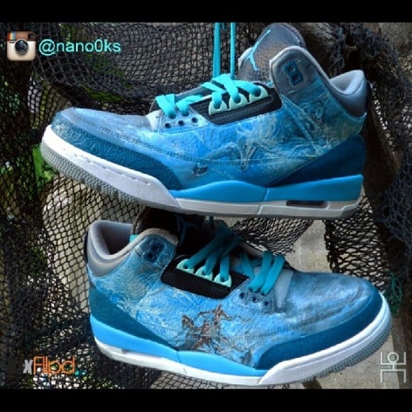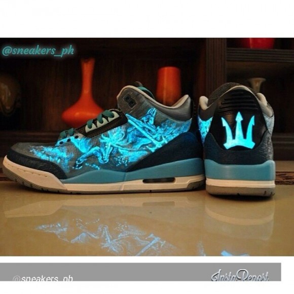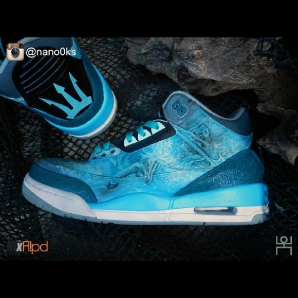 Custom sneakers come a dime a dozen, but every now and then we catch a holy pearl in a sea full of clams! That was my cheesy way of transitioning into this next pair of custom shoes from Kicks Flipped Customs team member, Renan Lingan, who recently did one hell of a job on the notorious AJ3. The Air Jordan III (3) “Trident” customs by Renan Lingan feature a blue make up of various shades creating an oceanic aesthetic with black tones throughout.ย The whole foot of the shoe is a Dehong He inspired mural of mysterious aqua king, Poseidon, along with his famous Greek mythology symbol taking place on the rear of the shoe in a glowing blue. To offset the monochromatic blue scheme, a white midsole finds it’s way under the uppers, with an icy outsole topping off these kicks. These have got to be one of the sickest pairs of customs to drop so far this year! Be sure to check out more Renan Lingan and the rest of Kicks Flipped Customs work! More pics below!