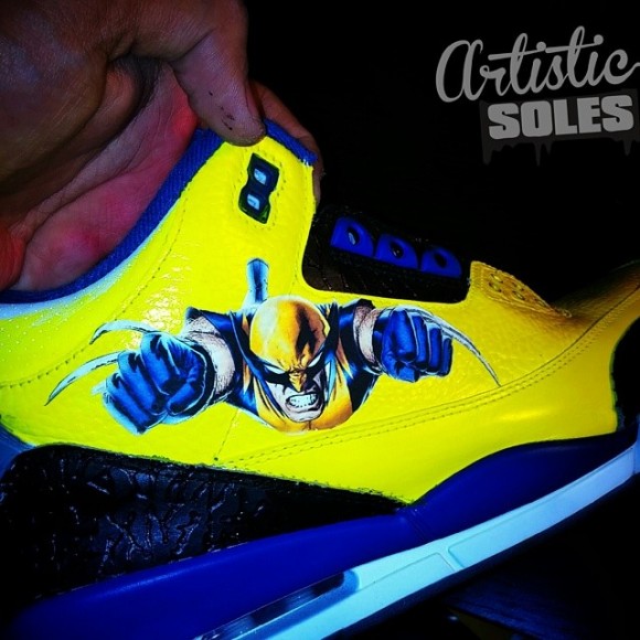 Last week, we got a preview of the newest AJ3 “Wolverine” customs by Kickstradomis (formerly @Sal_Artisticsoles), but he’s back with a full set of images of these works of art.ย The Air Jordan III (3) “Wolverine” customs by Kickstradomis use the original X Men yellow and blue, with portraits of Wolverine near the rear on the uppers. On the left sneaker, Wolverine can be seen peeking from behind black leather paneling, while he is seen launching into attack on the right shoe. Taking it one step further, Kickstradomis altered the Jumpman to resemble a blade-wielding Logan on the grey tongues. Blue accenting on the mudguards and lining comes into play to finish off the sweet details on these custom kicks! Kickstradomis branding and a side profile of Wolverine are printed on the insoles, as well. Great job, Kickstradomis!