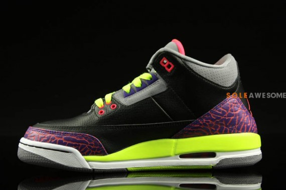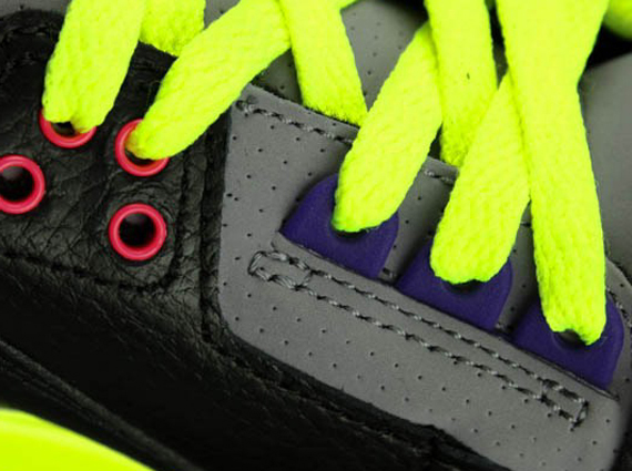 For all the GS sneakerheads, you will most assuredly enjoy checking out these brand new images for the Black/Purple/Volt Air Jordan III GS. Though we still don’t have a definite release date to share with you all, we have some brand spanking new angles posted after the jump. Sporting and appearance that looks rather similar to the “Joker” release from earlier this year, this particular version swaps out the Electric Green for a dope touch of Volt, accompanied by hits of a lighter shade of purple and vibrant splashes of pink about the Jumpman logo, inner face of the tongue and lace eyelets. Keep reading after the jump to check out all the new images and be sure to keep checking with SneakerFiles for more information.