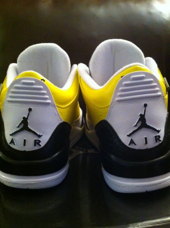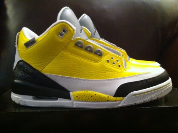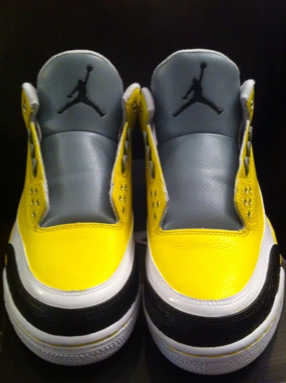 We viewed his work with the Air Jordan VI “Tokyo 23” Custom that he did a couple months ago. And the pack is finally complete with his Air Jordan III. This III Retro features cues that make this pack unique, like the yellow upper, black elephant print on the heel and toe box, and a black and yellow speckled midsole. His work with the customs are factory grade, as he tops it off with a gray tongue. To check out more of his work, visit his blog.