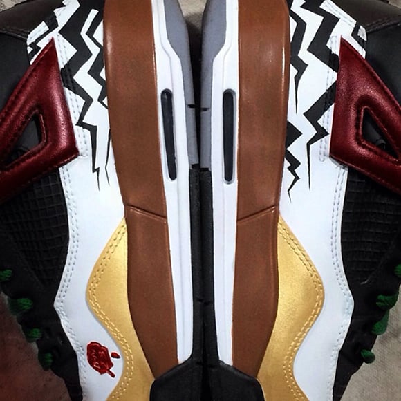 Where is the one place you can get all of the Jordan’s from the Bin 23 Premio collection, if you answered from Mache Customs then you are certainly correct! Although created for a GS customer, these “What The Bin’s” include pieces from all of the collection that has already released. The mesh panels as well as the blacked out heel tab make their way over from the Jordan V, while the zig-zag heel design and laces are from the Jordan VII. The chocolate-y brown on the midsole is from the Jordan II’s and last but not least, the midsole and and “wings” from the Jordan XIII’s complete these dope customs. Precision detailing and inspiration from an ill set of kicks bring us these Jordan IV “What The Bin’s.”