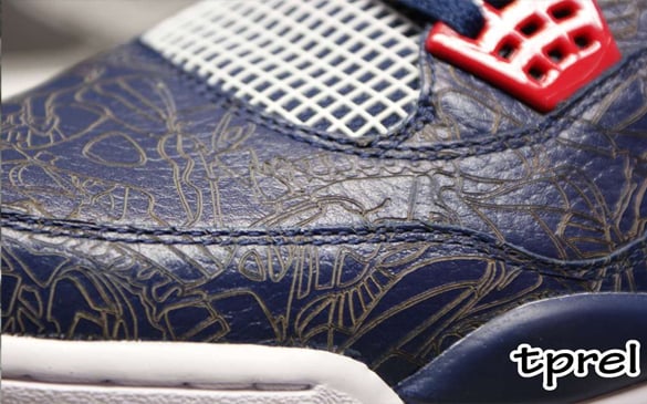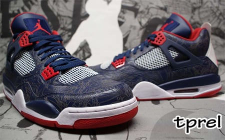 Five months have passed since the USA “Redeem Team” took home the gold medal in the Summer Olympics in Bejing, but we are now getting a first look at an Air Jordan IV made exclusively for Carmelo Anthony in celebration of the win. This AJ4 is extremely unique to say the least and would most definitely sell like hotcakes if it was ever released.ย Featuring delicate laser print on top of a navy blue leather base, this pair sports an elegant, yet stylish feel. Also yielding red wing tips, a white midsole, a red outsole, and white netting, these sneakers are obviously inspired by the typical USA colors of red, white, and blue.ย Sorry to break your dreams, but these will most likely never be released and these pictures are as close as you will ever get to holding them. Via NT.