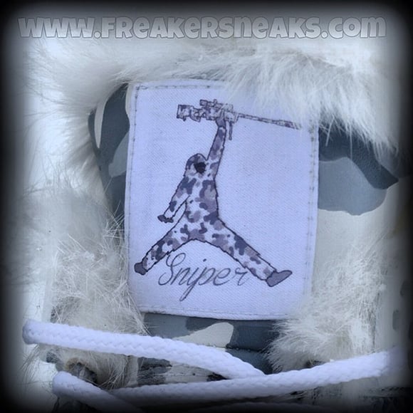 After blowing up the custom game with the Air Jordan IV (4) “LeJordan” a few days back, Freaker Sneaks is back at it with another crazy design that will have some sneakerheads losing sleep. These “Snow Sniper” Jordan IV’s are decked out with a fur texture on the inner lining to make these more of a winter time sneakerboot. Grey camouflage takes over the entire upper on these IV’s as well as the Snow Sniper that took the place of the Jumpman on the tongue. Sniper details were places on the outside near the ankles while the white laces cap off another sick custom by Freaker Sneaks.