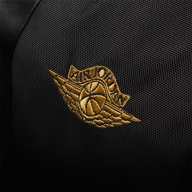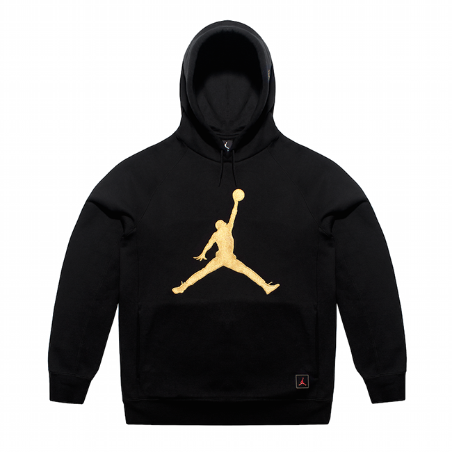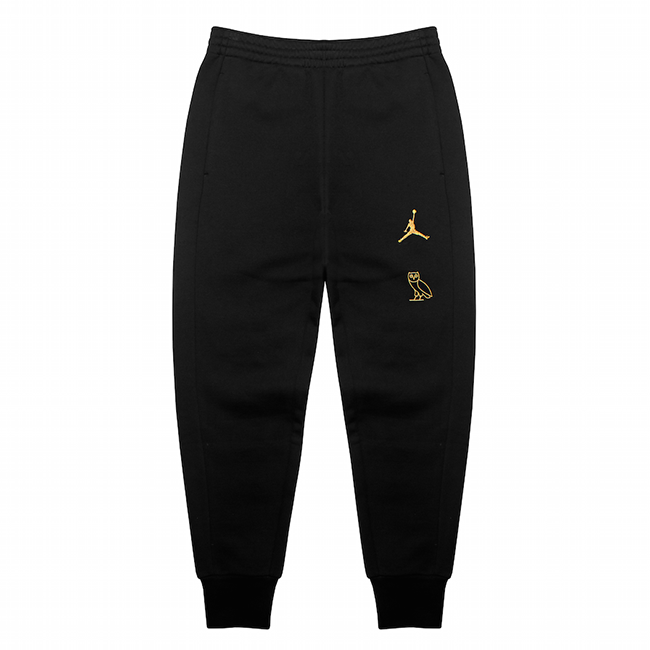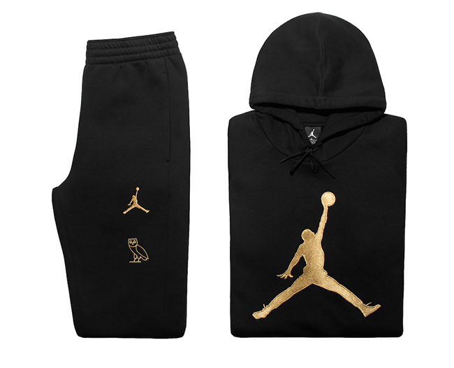The Jordan fleece hoodie and pant come in black with gold accents. An oversized Jumpman on the chest of the hoodie is complimented on the pant by a Jumpman and owl logo lock up.