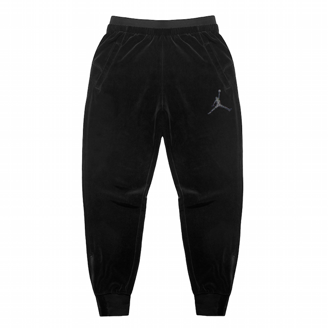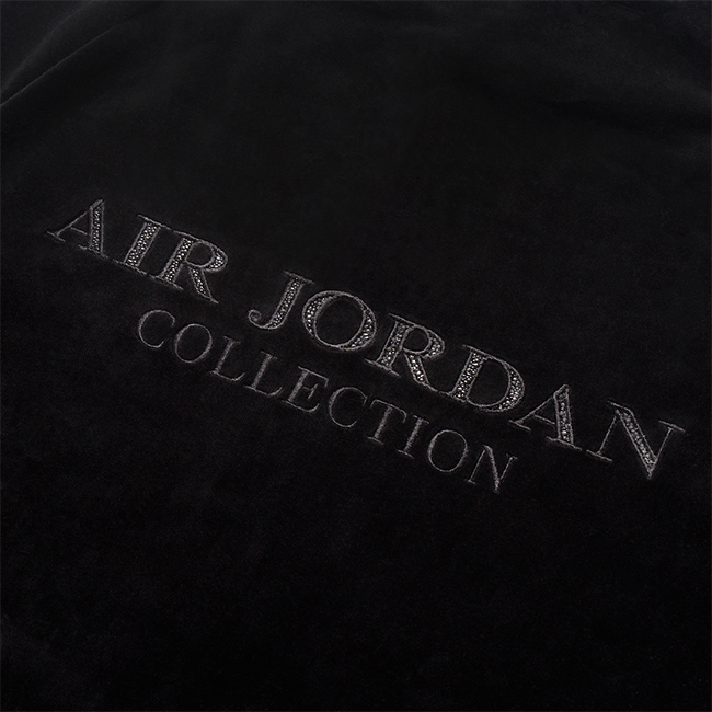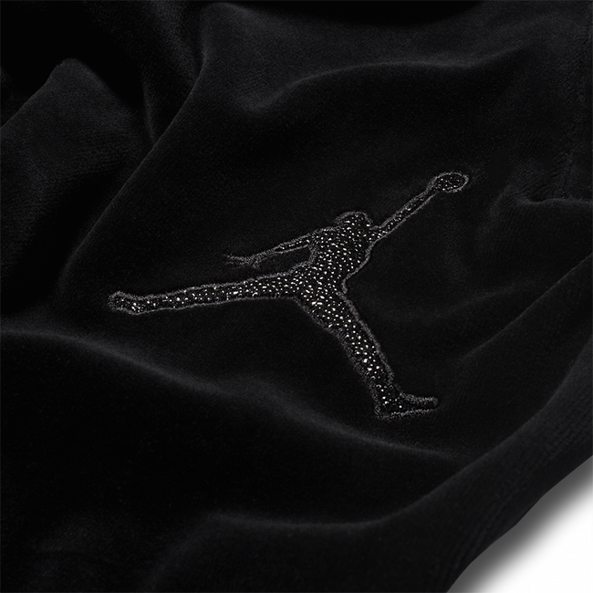 The pant and hoodie of the Jordan velour suit are embellished with a Jumpman logo.