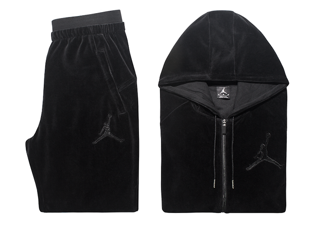 The apparel offering in the Jordan X OVO collection consists of a traditional Air Jordan sweatsuit and a brand new velour suit.