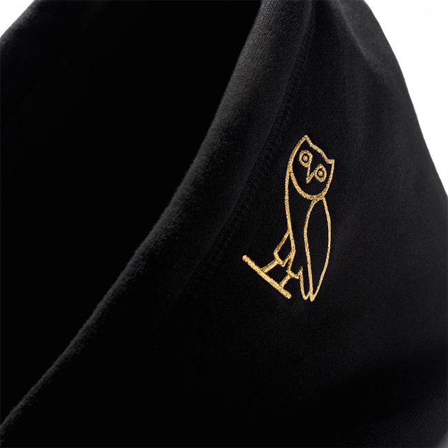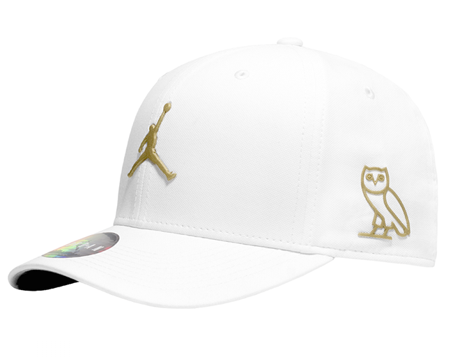 The collection also includes a white baseball cap with the gold Jumpman on the front and gold owl on the side and a black beanie with the gold logos on opposite sides. A Jordan x OVO duffel complements the entire collection.