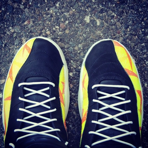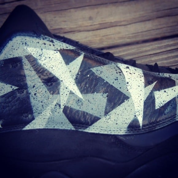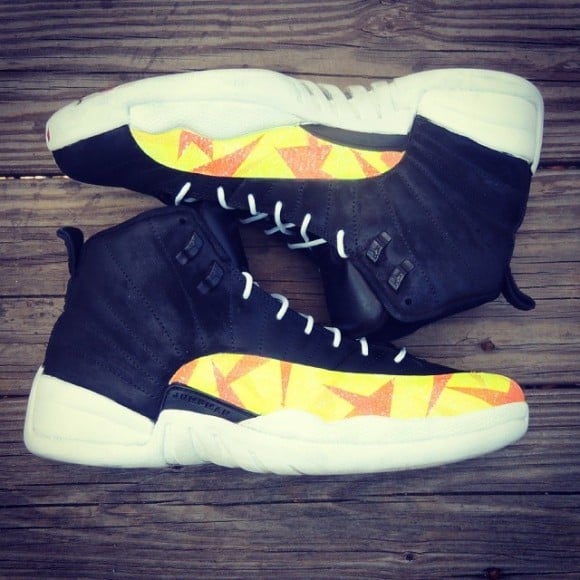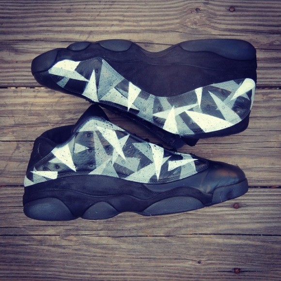The Air Jordan “Prism Pack” customs by Kicks Galore includes black Air Jordan 11, 12 and 13 models with yellow, blue, or white accents. The AJ11 Lows in this project features multiple shades of blue in prism shape blocking on the lower portion of the uppers, with an icy outsole. The AJ12s have a bold yellow and orange prism blocking on the uppers, with black taking over the top half, and white clinging onto the entire sole. The all black AJ13 has white and grey prisms all over the side panels of the uppers.