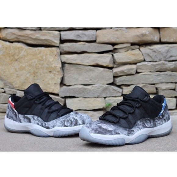With Nike marking the 45th anniversary of the first moon landing with the special edition of the AM90s, custom sneaker artist AMAC Customs is taking the same visual concept, but applying the lunar theme to a pair of AJ11 Lows! The Air Jordan Retro 11 Lows ‘Moon Landing’ customs by AMAC Customs have the crater-filled print on the patent leather portion of the shoes. The red, white and blue stars and stripes claim their place on the rear ankle collars. The original icy sole of the AJ11 Low ‘Infrared 23’ remain in tact, along with the original blacked out mesh uppers. Keep scrolling to see some extra shots of these kicks! And if you’re interested in purchasing these, get a move on- AMAC is making 5 of these!