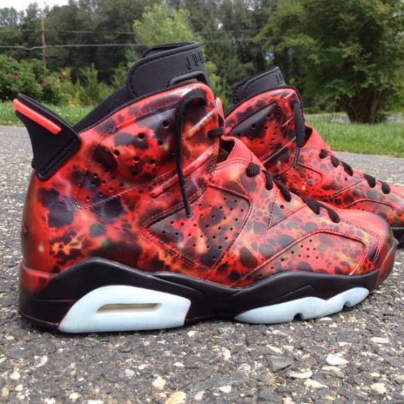As the year of the 6 keeps rolling on, we’re starting to see the last bit of official colorways that are going to be releasing from Jordan Brand in the coming months, but we’re getting a look at some exclusive heat, provided by SWB Artwear. The Air Jordan Retro 6 ‘Lava’ customs by SWB Artwear is the latest project from the artist, and was inspired by the smoldering flow of molten rock, using a blazing red with blackened hot spots. The entire shoe features the molten-like pattern, even the Jumpman logo, but if you take a closer look down below, you can see thin, wisp streams of smoke. And if these shoes weren’t dope enough, the soles glow in the dark! Visit the SWB Artwear site for more customs, and keep scrolling for some additional, detailed photos of these AJ6 ‘Lava’ customs now!