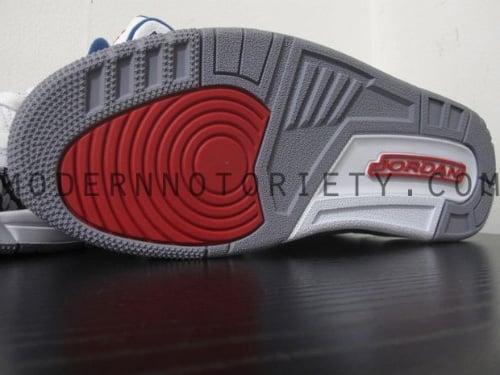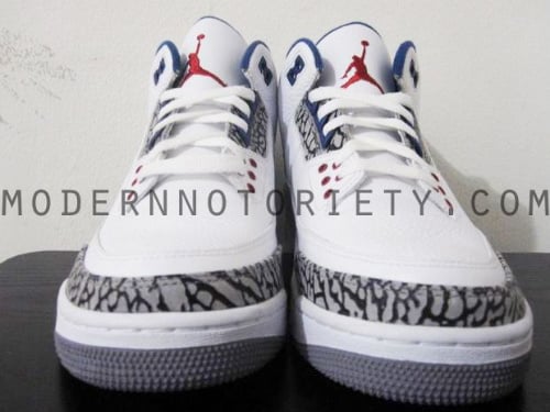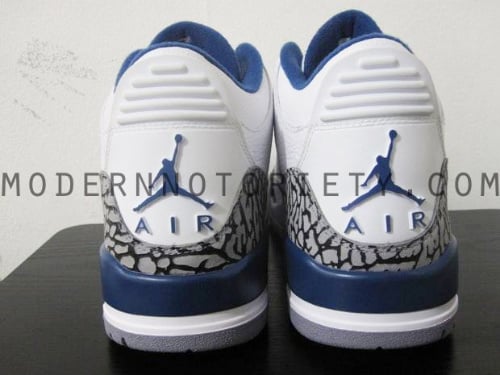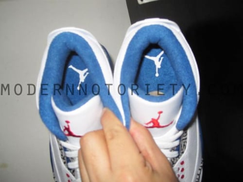 Finally we get a first look at the second pair ofย the Air Jordan III to release later this year, images have surfaced of the 2011 retro of the AJ III ‘True Blue’. Last released in 09, except in the states, the ‘True Blue’ returns this June. Compaired to the last retro not much has changed, besides a bolderย elephant print beingย used on the toe and heel area and eye stay. True blueย is seen onย the midsole, lace eyelets, inner liner and heel branding, whileย Hints of redย appear on the lace eyelets, tongue Jumpman and outsole. The Air Jordan III ‘True Blue’ is schedule for a June release, continue after the jump for detailed shots of this upcoming retro. viaย MN.