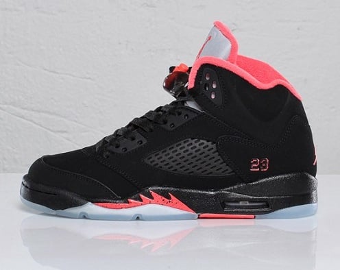 Needless to say, the black/metallic silver and “wolf grey” Air Jordan Vs are the biggest Vs dropping this year (unless the Laneys make an impromptu appearance and basically send all of the sneaker world into a frenzy). But Jordan Brand also prepared a black/alarming red Air Jordan retro V in Grade School sizes only. So for those of you with little feet or little people in your lives with little feet, you might want to know that this colorway can now be found in stores since this past Saturday, May 7th. It retails for $100, but will you be looking to fork that up for these?