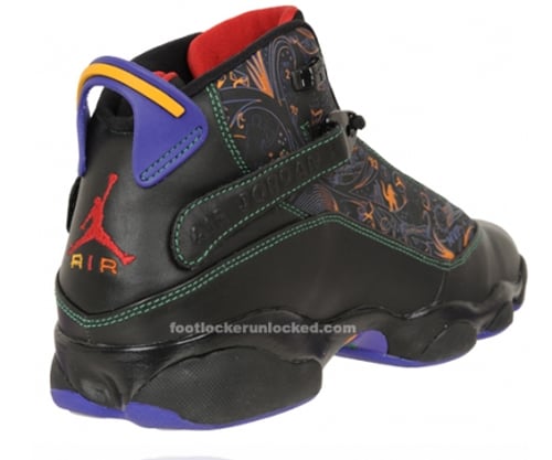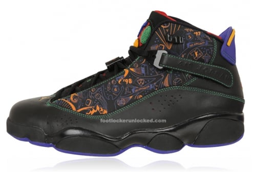 The Air Jordan 6 Rings has become one of Jordan Brand’s favorite sneakers (seems like it) and new colorways pop-up very frequently, here’s a look detailed look at a style that surfaced earlier in the year. With all the Championship Pack Air Jordan 6 (Six) Rings popping up, this pair might be all colors combined in one, making this Jordan 6 Rings contributed to all teams. The Six Rings is on the more colorful side and features multiple colors that includes a black base, a varsity red Jumpman logo on the tongue, classic green stitching, varsity purple sole, and a multicolored design at the sides. Available at Footlocker on January 24th.