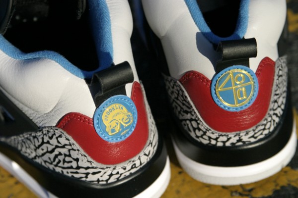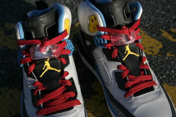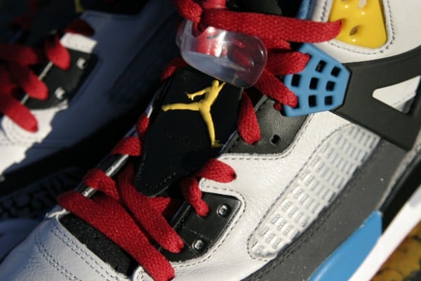 One of the crazier looking colorways we’ve seen on the hybrid, these sport a colorway similar to that of the classic Air Jordan VII with a predominately grey upper alongside black, maroon, blue and yellow accents throughout.