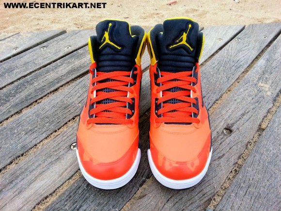 The Brooklyn Art Project: Air Jordan V (5) “Coney Island” by Ecentrik Artistry see an orange upper with black script on the rear panels with yellow accents.. Right away, you can see the nickname of these AJ5s scrolled across the top panels of the right side uppers, which match the shark teeth ridges found within the midsole. A yellow Jumpman on the tongues continue the use of the yellow, as well as the lining. And it this Coney Island theme ain’t complete if Tilly Face didn’t play a role. The Coney Island mascot can be seen on the top portion of the paneling on the left sneaker. On the rear panels, famous attractions of Coney Island spread across the heel guard. Names like Luna Park and The Warrior can be seen from the above photo. Ecentrik’s use of black tones down the otherwise bright sneakers, by appearing on the midfoot netting, midsole, and tongues.