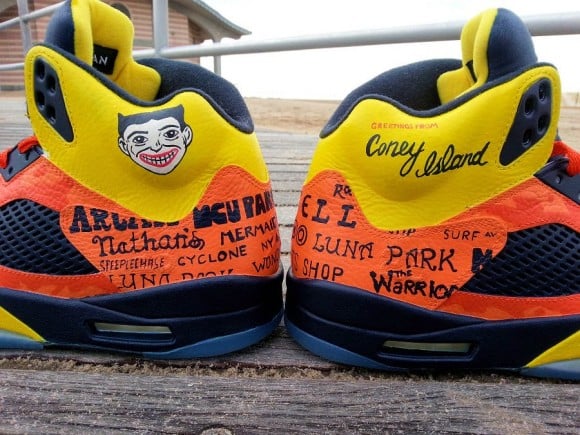 The next pair of customs coming our way from Ecentrik Artistry’s “Brooklyn Art Project,” are a pair of Air Jordan V (5) sneakers, complete with classic Coney Island insginia adorned allover the shoes.