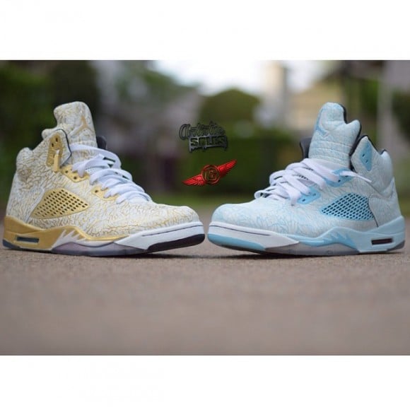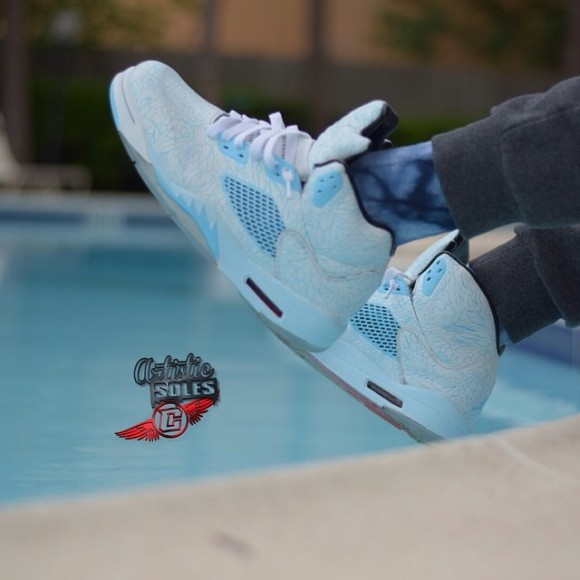 Back in March, Artistic Soles member Ceesay14 hit us with his clean pair of custom AJ12 “Legend Blue” kicks, and now we’re seeing the same theme on a different pair of Jordan classics. The Air Jordan V (5) “Legend Blue” customs by Ceesay14 see the icy color appear all over the shoes in a trendy elephant print, coupled with icy outsoles. From the lace eyelets, to the mesh midfoot panels and shark teeth rivets on the soles, legend blue dominates this sneaker top to bottom. The black lining accentuates the AJ5’s clean cut silohuette. Ceesay14 always does great work, but these babies are just top notch! Check out photos of these, and the AJ12 “Legend Blue” shoes below!