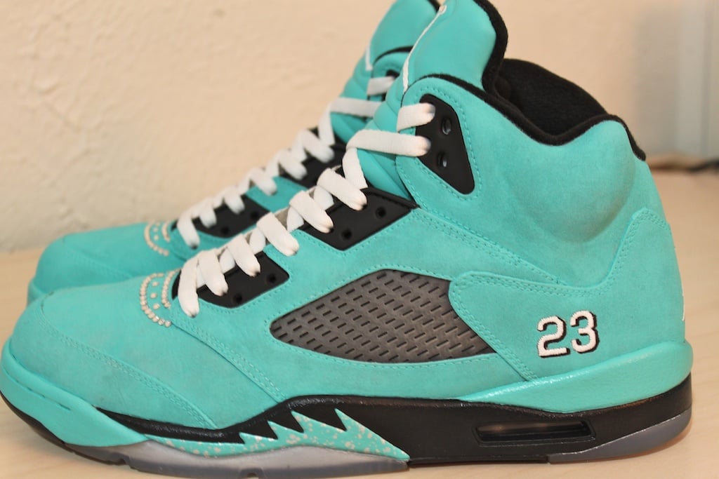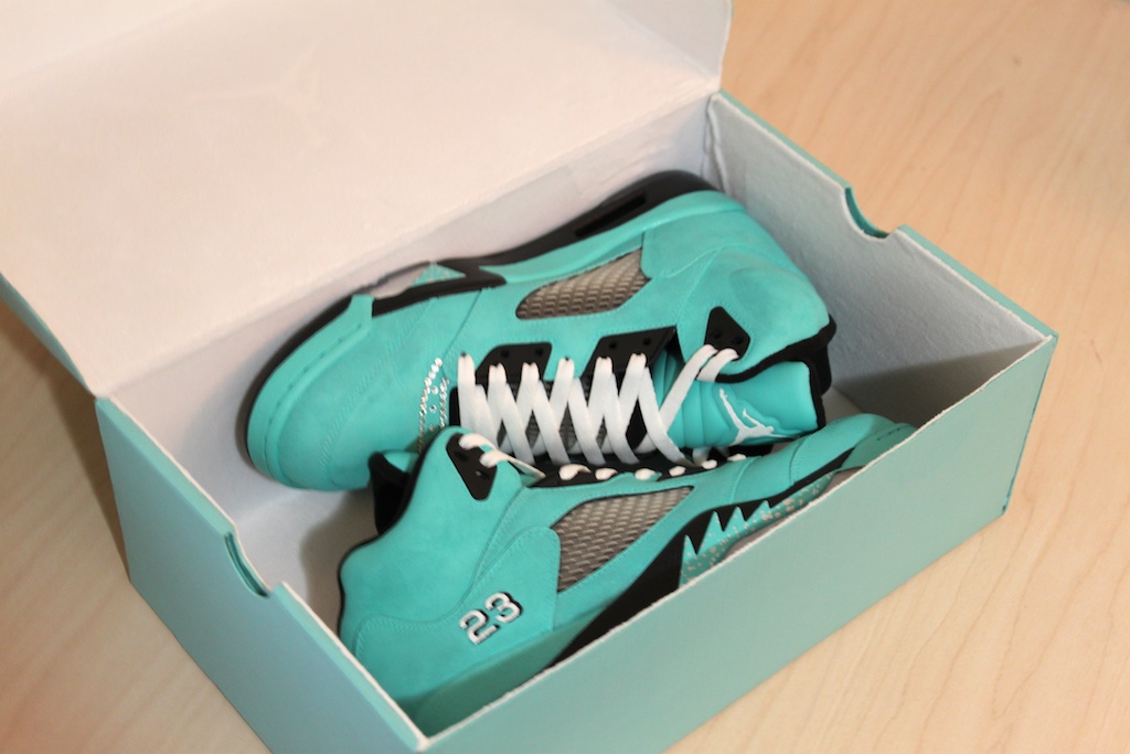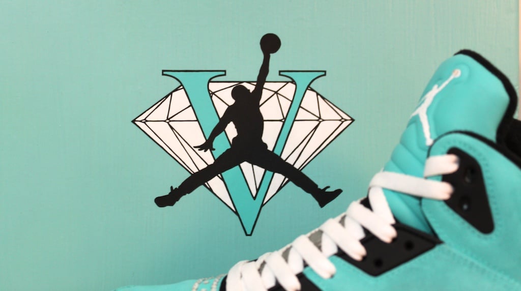 The ‘Tiffany’ theme is carried over this time around with the entire upper in a vibrant turquoise colorway set of with hit of black throughout. Jewel were added to portions of the upper and even on the Jumpman to really set off the theme beautifully. Top it all off with a crazy custom box and you have yourself another custom piece of art to add to the collection.