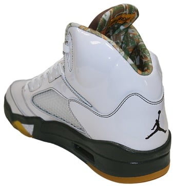 It seems as though ever since Will Smith sported the Air Jordan V โGrapeโsโ on the Fresh Prince of Bel-Air, the Air Jordan V has become a fan favorite. With the Air Jordan V โArmy Green,โ Jordan Brand integrated into the model what many love the Air Jordan XI for- patent leather. With a white patent leather upper, army green around the sole, and yellow and brown accents, this exclusive and rare Jordan has become a favorite of many who, for example, also liked the Laser Vโs that released a few years back. Check in with us after the jump for more pix and where to purchase this pair of Vโs at a reasonable price.