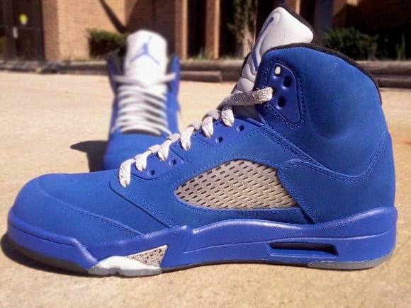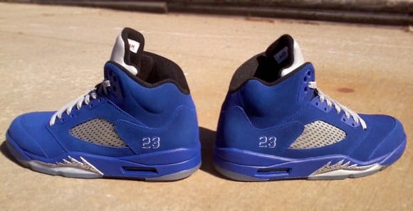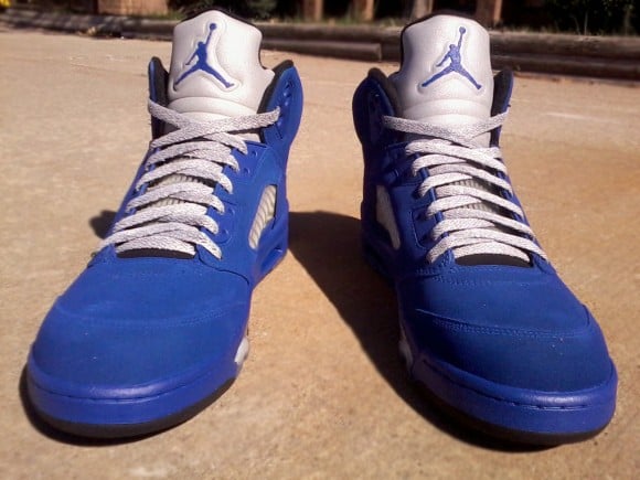 Mr. Exclusive Customs is back on the scene with yet another dope custom creation. Using the “Metallic” Air Jordan V as his base, Mr. Exclusive Customs has crafterd this ill pair of “Stealth Royal Metallic” Air Jordan V’s. Upon painting the entire midsole royal blue, except for the shark teeth, this latest pair of customs also comes fully equipped with a suede dyed royal blue upper to match. In case all of you sneakerheads were wondering where the stealth factor comes into play, you may notice that the Jumpman has also received a touch or royal blue in an effort to have it discreetly camouflaged about the heel. Check out a detailed look after the jump and be sure to drop us a line in the comments section below.