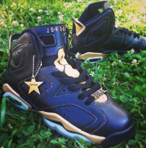 In creating a custom pair of Air Jordan VI’s for the Miami based women’s apparel line Caviar Blaque, sneaker customizer District Customs latest body of work is strictly for the ladies. Although we have already seen the black/gold color scheme on the Air Jordan VI thanks to the DMP pack, this particular pair of customs uses a leather based pair of AJVI’s as the canvas. Coming fully equipped with an upper flanked with hidden paisley designs and gold sections that use actual 23 carat gilded gold, District Customs latest creation is definitely worth its weight. Keep reading after the jump to check out some dope shots of this “Caviar Blaque” Air Jordan VI customs and be sure to let us know how you feel about these in the comments section below.